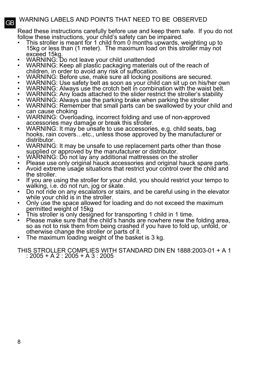 • This stroller is meant for 1 child from 0 months upwards, weighting up to 15kg or less than (1 meter). The maximum load on this stroller may not exceed 15kg. • WARNING: Do not leave your child unattended • WARNING: Keep all plastic packaging materials out of the reach of children, in order to avoid any risk of suffocation. • WARNING: Before use, make sure all locking positions are secured. • WARNING: Use safety belt as soon as your child can sit up on his/her own • WARNING: Always use the crotch belt in combination with the waist belt. • WARNING: Any loads attached to the slider restrict the stroller’s stability • WARNING: Always use the parking brake when parking the stroller • WARNING: Remember that small parts can be swallowed by your child and can cause choking • WARNING: Overloading, incorrect folding and use of non-approved accessories may damage or break this stroller. • WARNING: It may be unsafe to use accessories, e.g. child seats, bag hooks, rain covers…etc., unless those approved by the manufacturer or distributor. • WARNING: It may be unsafe to use replacement parts other than those supplied or approved by the manufacturer or distributor. • WARNING: Do not lay any additional mattresses on the stroller • Please use only original hauck accessories and original hauck spare parts. • Avoid extreme usage situations that restrict your control over the child and the stroller. • If you are using the stroller for your child, you should restrict your tempo to walking, i.e. do not run, jog or skate. • Do not ride on any escalators or stairs, and be careful using in the elevator while your child is in the stroller. • Only use the space allowed for loading and do not exceed the maximum permitted weight of 15kg • This stroller is only designed for transporting 1 child in 1 time. • Please make sure that the child’s hands are nowhere new the folding area, so as not to risk them from being crashed if you have to fold up, unfold, or otherwise change the stroller or parts of it. • The maximum loading weight of the basket is 3 kg. THIS STROLLER COMPLIES WITH STANDARD DIN EN 1888:2003-01 + A 1 : 2005 + A 2 : 2005 + A 3 : 2005