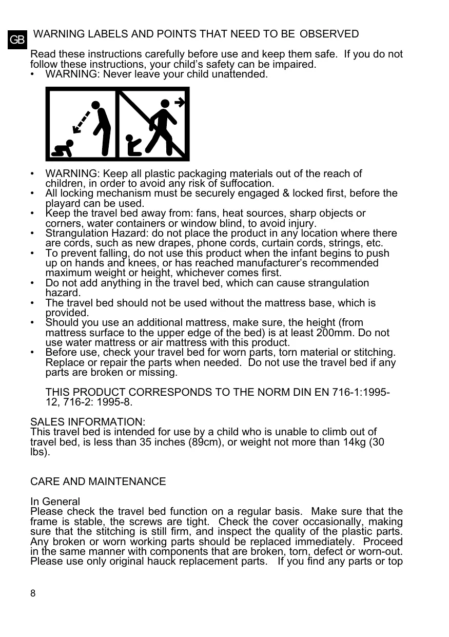 • Risque d‘étranglement : ne mettez jamais le lit d‘appoint en place près de cordons, par exemple ceux de nouveaux rideaux, ou à proximité de câbles téléphoniques et de cordons de rideaux ou de fils ou ficelles de tout genre. Evitez les risques de chute de votre enfant en renonçant à l‘emploi du lit d‘appoint dès que votre enfant tente de se mettre debout à l‘aide des mains et des genoux ou dès que son poids ou sa taille dépasse le poids ou la taille recommandé par le fabricant, selon le cas se présentant en premier. Ne posez jamais des objets qui seraient susceptibles de présenter un risque d‘étranglement pour votre enfant dans le lit d‘appoint. L‘emploi du lit d‘appoint n‘est pas recommandé sans son matelas de fond fourni. Si vous voulez utiliser un matelas supplémentaire, veillez à ce que la hauteur (du dessus du matelas jusqu‘au bord supérieur du lit d‘appoint) comporte au moins 200 mm. Ne vous servez pas de matelas à eau et de matelas gonflables dans ce lit d‘appoint. Assurez-vous que le lit d‘appoint est dénué de pièces usées, de matériaux déchirés ou de coutures défaites avant de vous en servir. Remplacez ou réparez les pièces, le cas échéant. Renoncez au lit d‘appoint en présence de pièces brisées ou manquantes ! Assurez-vous que tous les blocages du lit sont bien verrouillés avant emploi. Le lit est uniquement près à l‘emploi si le mécanisme de blocage du système de pliage est correctement enclenché. Ne laissez rien dans le lit que l‘enfant pourrait utiliser pour l‘escalader. CE PRODUIT EST CONFORME A LA NORME DIN EN 716-1:1995-12, 716-2: 1995-8