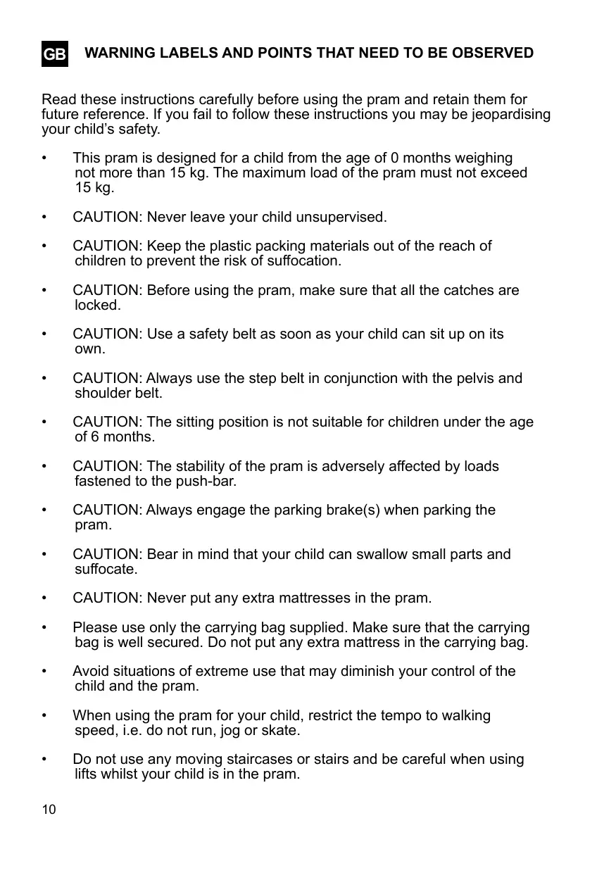 WARNING LABELS AND POINTS THAT NEED TO BE OBSERVED Read these instructions carefully before using the pram and retain them for future reference. If you fail to follow these instructions you may be jeopardising your child’s safety.