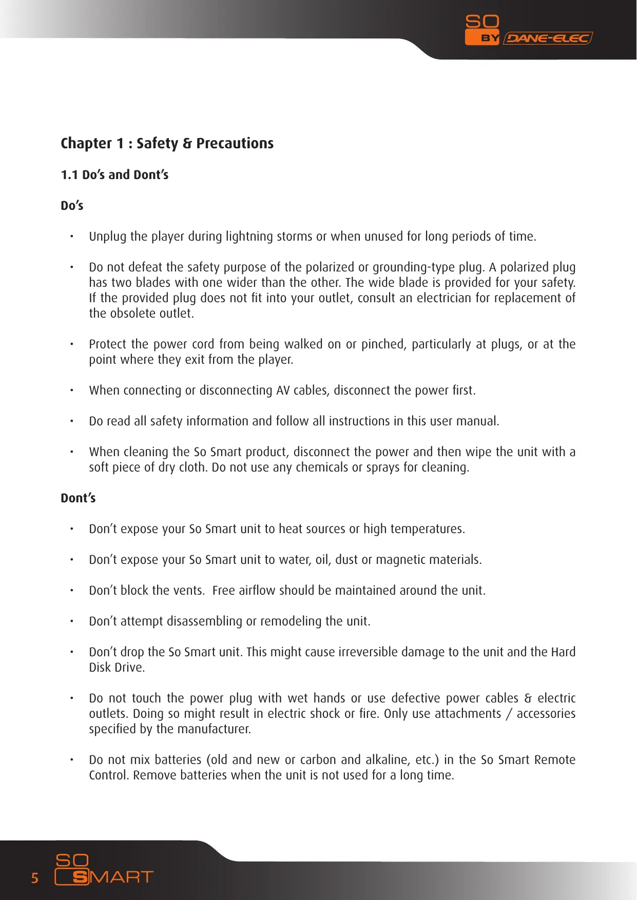 Unplug the player during lightning storms or when unused for long periods of time. Do not defeat the safety purpose of the polarized or grounding-type plug. A polarized plug has two blades with one wider than the other. The wide blade is provided for your safety. If the provided plug does not fit into your outlet, consult an electrician for replacement of the obsolete outlet. Protect the power cord from being walked on or pinched, particularly at plugs, or at the point where they exit from the player. When connecting or disconnecting AV cables, disconnect the power first. Do read all safety information and follow all instructions in this user manual. When cleaning the So Smart product, disconnect the power and then wipe the unit with a soft piece of dry cloth. Do not use any chemicals or sprays for cleaning. nt's Don't expose your So Smart unit to heat sources or high temperatures. Don't expose your So Smart unit to water, oil, dust or magnetic materials. Don't block the vents. Free airflow should be maintained around the unit. Don't attempt disassembling or remodeling the unit. Don't drop the So Smart unit. This might cause irreversible damage to the unit and the Hard Disk Drive. Do not touch the power plug with wet hands or use defective power cables & electric outlets. Doing so might result in electric shock or fire. Only use attachments / accessories specified by the manufacturer. Do not mix batteries (old and new or carbon and alkaline, etc.) in the So Smart Remote Control. Remove batteries when the unit is not used for à long time.
