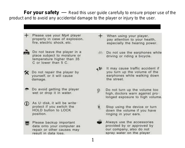 For your safety — Read this user guide carefully to ensure proper use ofthe product and to avoid any accidental damage to the player or injury to the user.