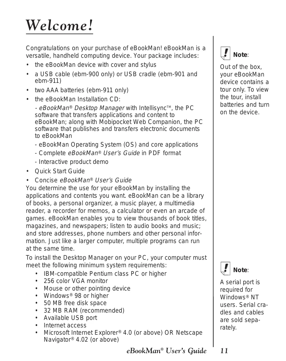 Welcome! Congratulations on your purchase of eBookMan! eBookMan is à versatile, handheld computing device. Your package includes: + the eBookMan device with cover and stylus + _a USB cable (ebm-900 only) or USB cradle (ebm-901 and ebm-911) + _ two AAA batteries (ebm-911 only) + the eBookMan Installation CD: - eBookMan® Desktop Manager with Intellisync'", the PC software that transfers applications and content to eBookMan; along with Mobipocket Web Companion, the PC software that publishes and transfers electronic documents to eBookMan - eBookMan Operating System (OS) and core applications - Complete eBookMan® User's Guide in PDF format - Interactive product demo + Quick Start Guide + Concise eBookMan® User's Guide You determine the use for your eBookMan by installing the applications and contents you want. eBookMan can be a library of books, a personal organizer, a music player, a multimedia reader, a recorder for memos, a calculator or even an arcade of games. eBookMan enables you to view thousands of book titles, magazines, and newspapers; listen to audio books and music; and store addresses, phone numbers and other personal infor- mation. J ust like a larger computer, multiple programs can run atthe same time. To install the Desktop Manager on your PC, your computer must meet the following minimum system requirements: + _IBM-compatible Pentium class PC or higher 256 color VGA monitor Mouse or other pointing device Windows® 98 or higher 50 MB free disk space 32 MB RAM (recommended) Available USB port Internet access Microsoft Internet E xplorer® 4.0 (or above) OR Netscape Navigator® 4.02 (or above) eBookMan® User’s Guide nu Note: Out ofthe box, your eBookMan device contains a tour only. To view the tour, install batteries and turn on the device. nu Note: A serial port is required for Windows® NT users. Serial cra- dles and cables are sold sepa- rately.