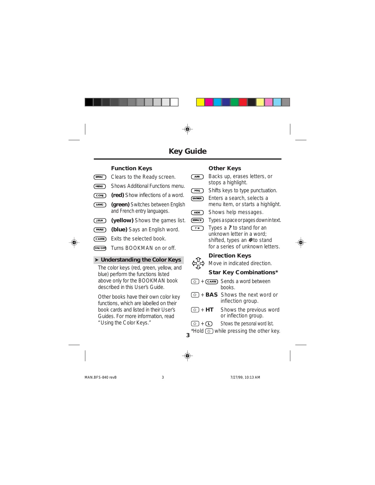 7/27/99, 10:12 AM Key Guide Function Keys EFFAC Clears to the Ready screen. MENU Shows Additional Functions menu. CONJ (red) Show inflections of a word. ARR MAJ LANG (green) Switches between English and French entry languages. JEUX (yellow) Shows the games list. PARLE (blue) Says an English word. CARTE Exits the selected book. ON/OFF ENTRER AIDE ESPACE