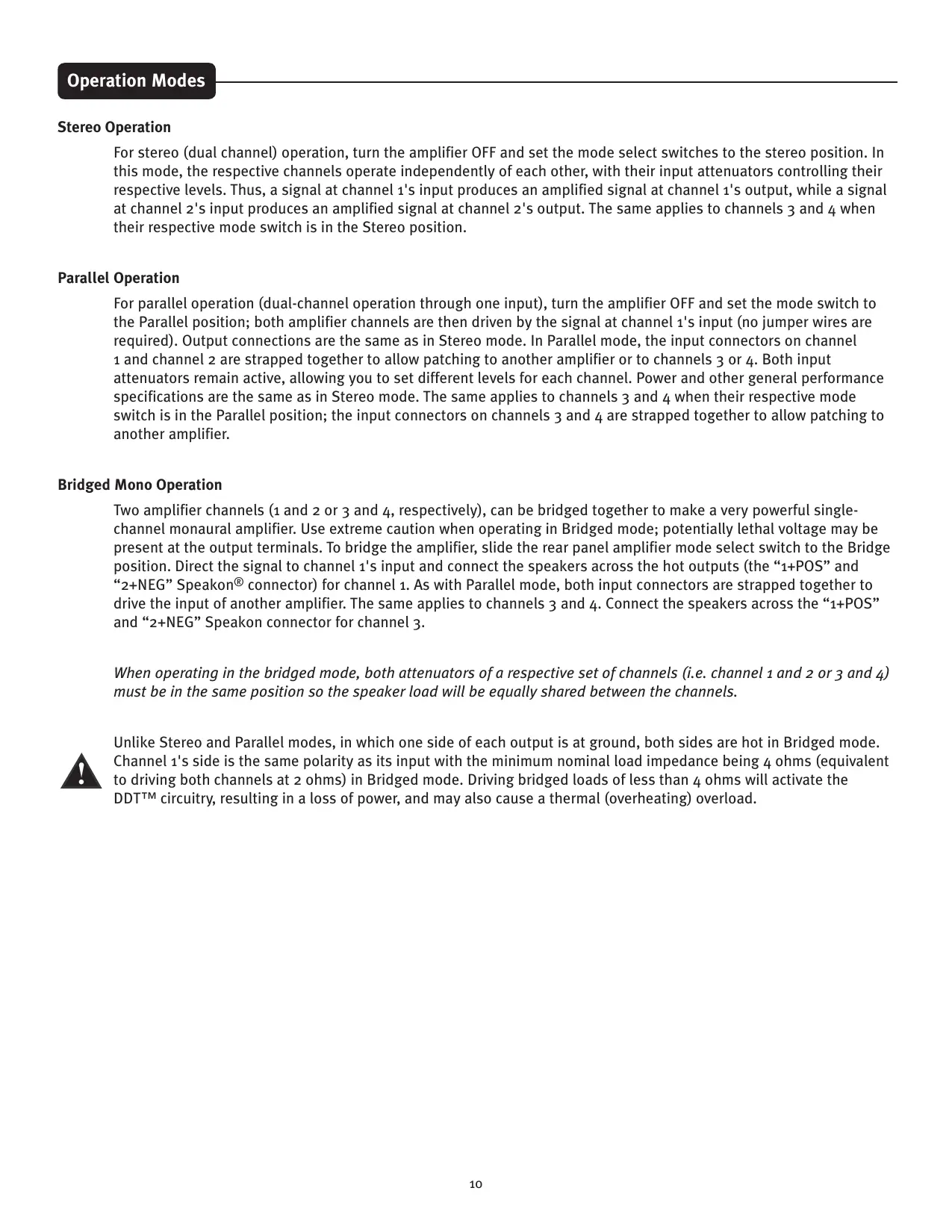 Operation Modes Stereo Operation For stereo (dual channel) operation, turn the amplifier OFF and set the mode select switches to the stereo position. In this mode, the respective channels operate independently of each other, with their input attenuators controlling their respective levels. Thus, a signal at channel 1's input produces an amplified signal at channel 1's output, while a signal at channel 2's input produces an amplified signal at channel 2's output. The same applies to channels 3 and 4 when their respective mode switch is in the Stereo position. Parallel Operation For parallel operation (dual-channel operation through one input), turn the amplifier OFF and set the mode switch to the Parallel position; both amplifier channels are then driven by the signal at channel 1's input (no jumper wires are required). Output connections are the same as in Stereo mode. In Parallel mode, the input connectors on channel 1 and channel 2 are strapped together to allow patching to another amplifier or to channels 3 or 4. Both input attenuators remain active, allowing you to set different levels for each channel. Power and other general performance specifications are the same as in Stereo mode. The same applies to channels 3 and 4 when their respective mode switch is in the Parallel position; the input connectors on channels 3 and 4 are strapped together to allow patching to another amplifier. Bridged Mono Operation Two amplifier channels (1 and 2 or 3 and 4, respectively), can be bridged together to make a very powerful singlechannel monaural amplifier. Use extreme caution when operating in Bridged mode; potentially lethal voltage may be present at the output terminals. To bridge the amplifier, slide the rear panel amplifier mode select switch to the Bridge position. Direct the signal to channel 1's input and connect the speakers across the hot outputs (the “1+POS” and “2+NEG” Speakon® connector) for channel 1. As with Parallel mode, both input connectors are strapped together to drive the input of another amplifier. The same applies to channels 3 and 4. Connect the speakers across the “1+POS” and “2+NEG” Speakon connector for channel 3. When operating in the bridged mode, both attenuators of a respective set of channels (i.e. channel 1 and 2 or 3 and 4) must be in the same position so the speaker load will be equally shared between the channels. Unlike Stereo and Parallel modes, in which one side of each output is at ground, both sides are hot in Bridged mode. Channel 1's side is the same polarity as its input with the minimum nominal load impedance being 4 ohms (equivalent to driving both channels at 2 ohms) in Bridged mode. Driving bridged loads of less than 4 ohms will activate the DDT™ circuitry, resulting in a loss of power, and may also cause a thermal (overheating) overload.