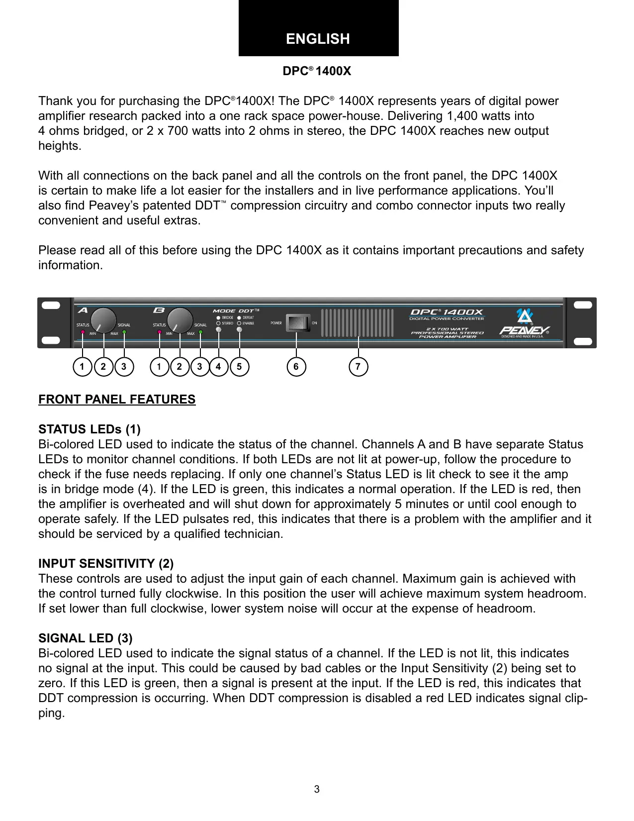 ENGLISH DPC® 1400X Thank you for purchasing the DPC®1400X! The DPC® 1400X represents years of digital power amplifier research packed into a one rack space power-house. Delivering 1,400 watts into 4 ohms bridged, or 2 x 700 watts into 2 ohms in stereo, the DPC 1400X reaches new output heights. With all connections on the back panel and all the controls on the front panel, the DPC 1400X is certain to make life a lot easier for the installers and in live performance applications. You’ll also find Peavey’s patented DDT™ compression circuitry and combo connector inputs two really convenient and useful extras. Please read all of this before using the DPC 1400X as it contains important precautions and safety information.