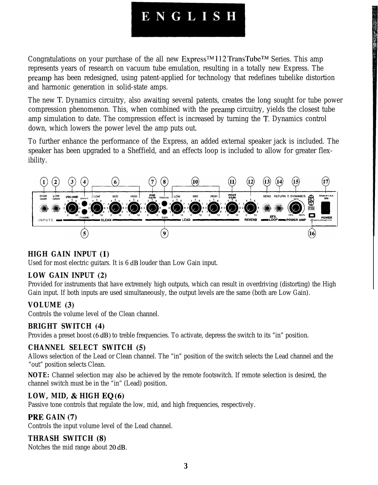 Congratulations on your purchase of the all new ExpressTM 112 TransTubeTM Series. This amp represents years of research on vacuum tube emulation, resulting in a totally new Express. The preamp has been redesigned, using patent-applied for technology that redefines tubelike distortion and harmonic generation in solid-state amps. The new T. Dynamics circuitry, also awaiting several patents, creates the long sought for tube power compression phenomenon. This, when combined with the preamp circuitry, yields the closest tube amp simulation to date. The compression effect is increased by turning the T. Dynamics control down, which lowers the power level the amp puts out. To further enhance the performance of the Express, an added external speaker jack is included. The speaker has been upgraded to a Sheffield, and an effects loop is included to allow for greater flexibility. -INPUTS I