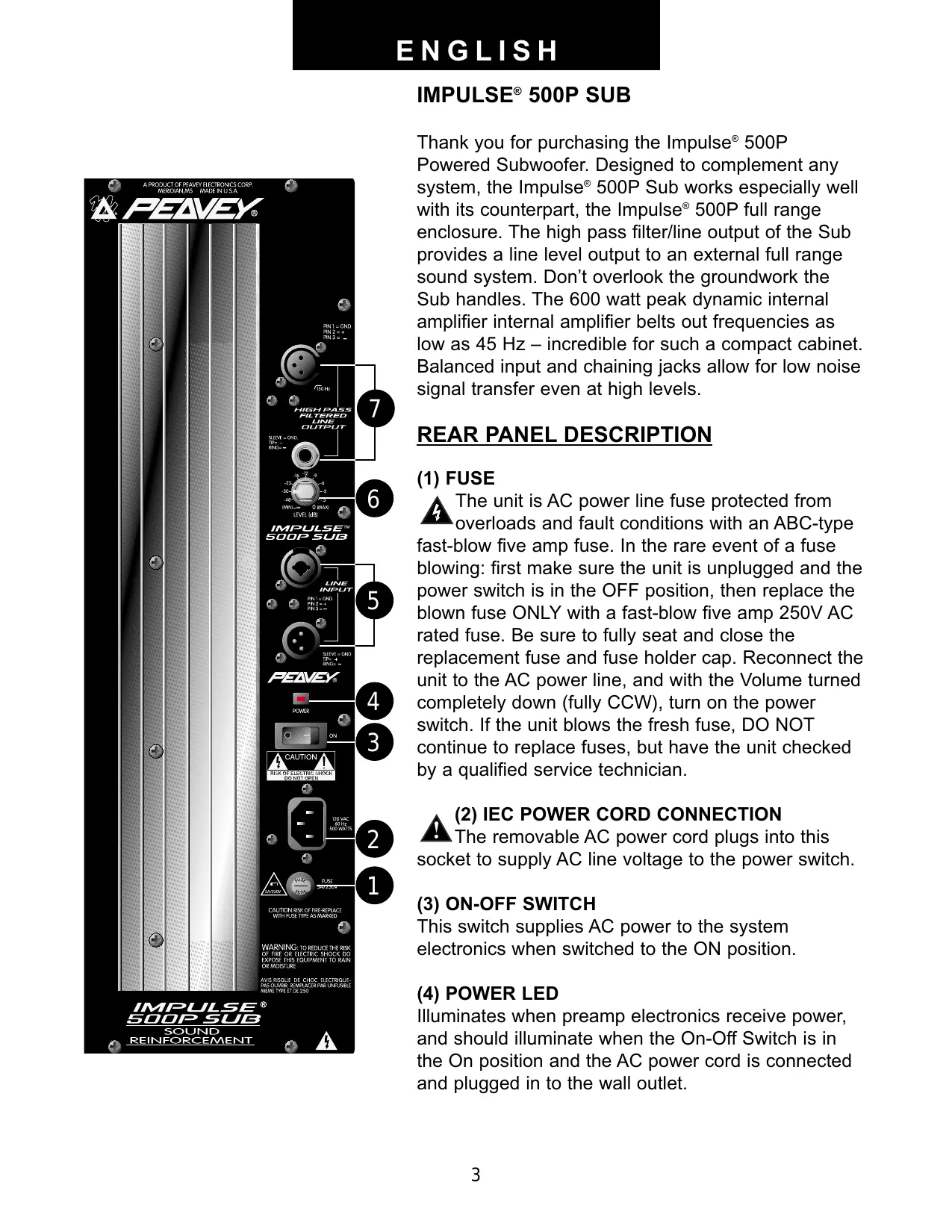 CARE and MAINTENANCE Your Impulse 500P Subwoofer is a sturdy and durable product, which will provide years of reliable use if properly cared for. Use common sense and read the safety warnings to avoid hazardous operating conditions. Sunlight/Heat Avoid prolonged exposure to direct sunlight, as this may cause the unit to overheat and thermally shut off. Excessively hot operating conditions can also cause a thermal shutdown. Do not store in extremely hot or cold conditions, or extremely high humidity. Always allow unit to come to room temperature before use. Cleaning Never clean the Impulse 500P Subwoofer while plugged in or turned on! When the unit has been fully disconnected from AC power sources, a slightly damp cloth can remove soil or other dirt. Never use strong solvents on the Impulse 500P Subwoofer, as they could attack the polymer that the cabinet is made from. Do not allow ANY fluids to drip inside the Impulse 500P Subwoofer! Touchup If the Impulse 500P Subwoofer cabinet should become scratched or abraded, it can be touched up using a black permanent marker. First, if the area to be touched up is larger than a short scratch, rub it lightly with an soapless plastic scrub pad. Wipe the scratched or abraded area a little at a time with the black permanent marker, and immediately wipe away the surplus with a lint-free cloth. For an overall finish enhancement and protective coating, use gloves to apply either WD-40° or Armour AI protectant to the surface of the plastic cabinet only. Notice that the cabinet will be slippery after these treatments. Rub them down vigorously with a dry lint-free cloth to minimize this. Insert Points (maximum depth of insertion) The insert points on the top and bottom of the cabinet must only be engaged to a depth of 3/8" or less to prevent air leaks if the mounts/bolts are removed later. Check for Secure Hardware After a long period of use, check the hardware of the Impulse 500P Subwoofer for tightness, including the rear panel screws, and the screws that hold the baffle and rear cabinet together. The unit is subject to a great deal of vibration, and this could cause them to be less than tight with continued use. DESCRIPTION The Peavey Impulse 500P Subwoofer is a powered subwoofer engineered to provide the highest levels of performance in a compact powered loudspeaker. Capable of over 124 dB peak SPL's, this subwoofer can pump out a huge amount of bass. The enclosure utilizes high-impact polypropylene in an injection-molded plastic trapezoidal form, with a coated perforated metal grille to offer a cosmetically elegant yet durable powered subwoofer.