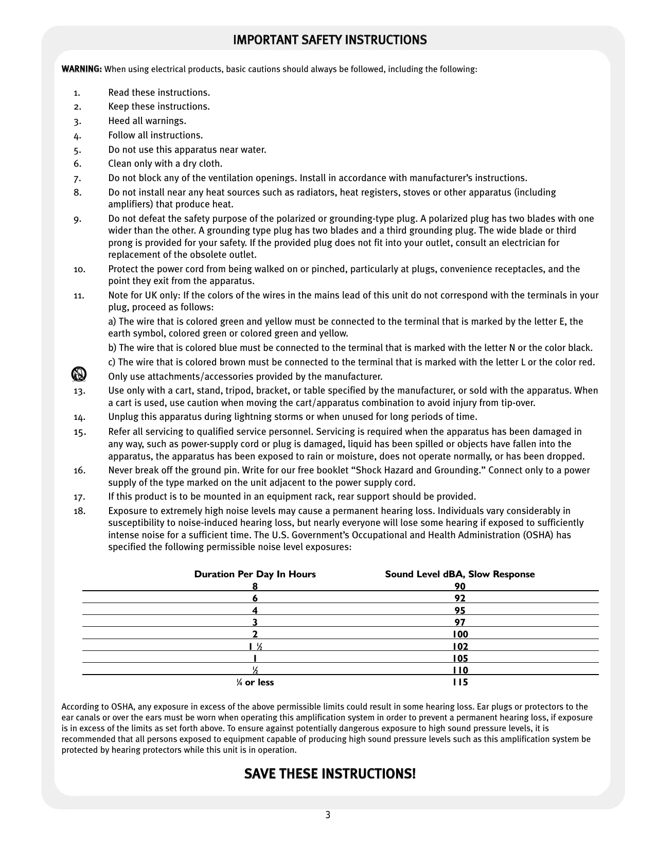 According to OSHA, any exposure in excess of the above permissible limits could result in some hearing loss. Ear plugs or protectors to the ear canals or over the ears must be worn when operating this amplification system in order to prevent a permanent hearing loss, if exposure is in excess of the limits as set forth above. To ensure against potentially dangerous exposure to high sound pressure levels, it is recommended that all persons exposed to equipment capable of producing high sound pressure levels such as this amplification system be protected by hearing protectors while this unit is in operation.