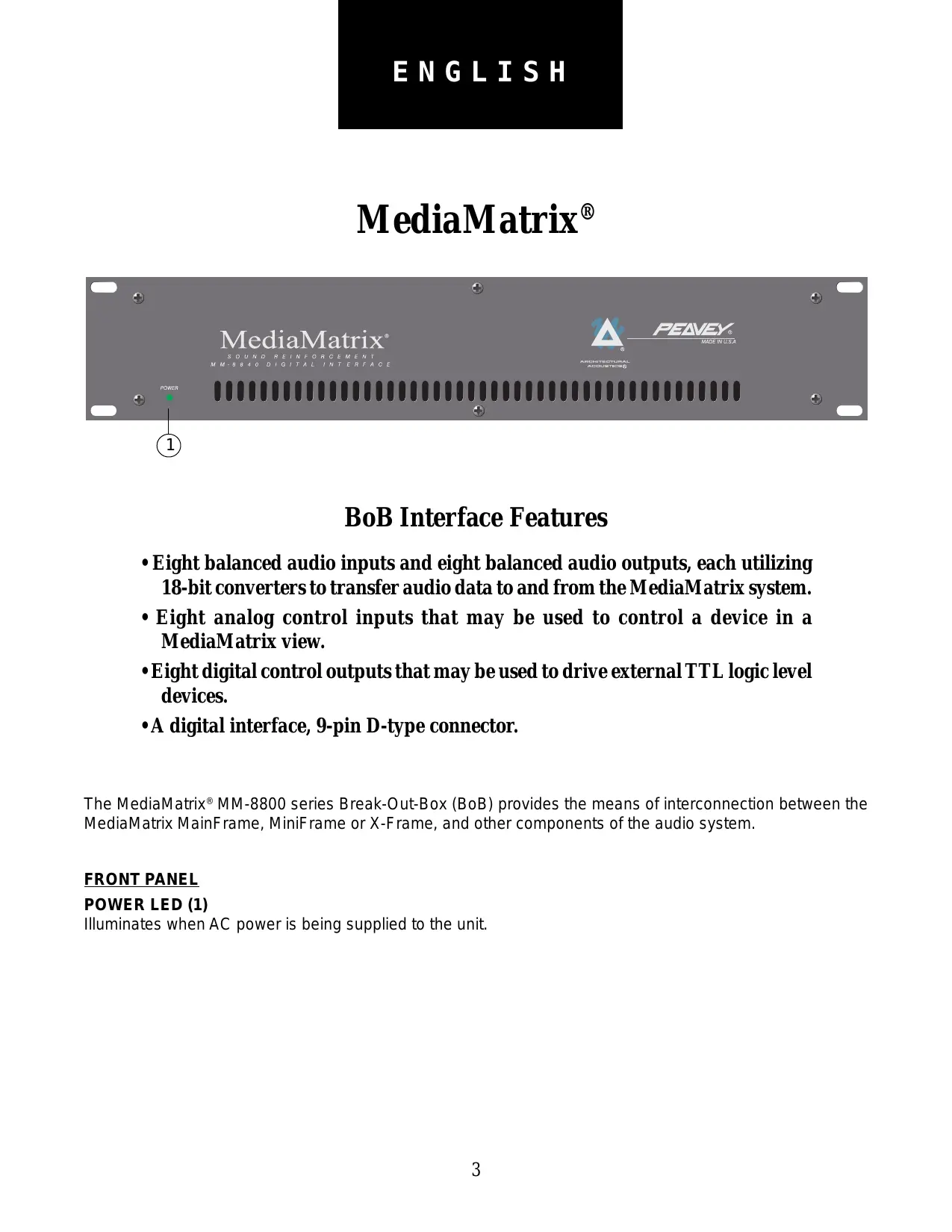 - A digital interface, 9-pin D-type connector. The MediaMatrix® MM-8800 series Break-Out-Box (BoB) provides the means of interconnection between the MediaMatrix MainFrame, MiniFrame or X-Frame, and other components of the audio system. FRONT PANEL POWER LED (1) Illuminates when AC power is being supplied to the unit.