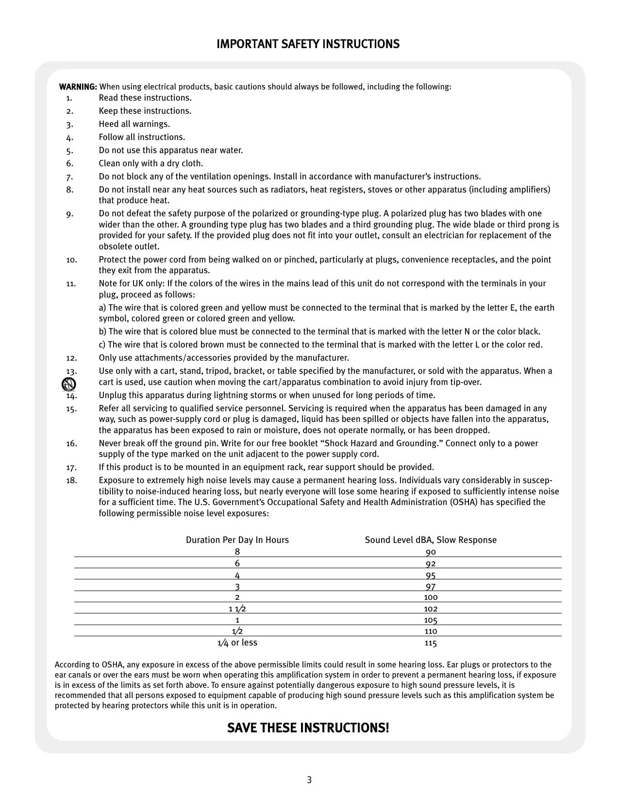 According to OSHA, any exposure in excess of the above permissible limits could result in some hearing loss. Ear plugs or protectors to the ear canals or over the ears must be worn when operating this amplification system in order to prevent a permanent hearing loss, if exposure is in excess of the limits as set forth above. To ensure against potentially dangerous exposure to high sound pressure levels, it is recommended that all persons exposed to equipment capable of producing high sound pressure levels such as this amplification system be protected by hearing protectors while this unit is in operation. SAVE THESE INSTRUCTIONS!