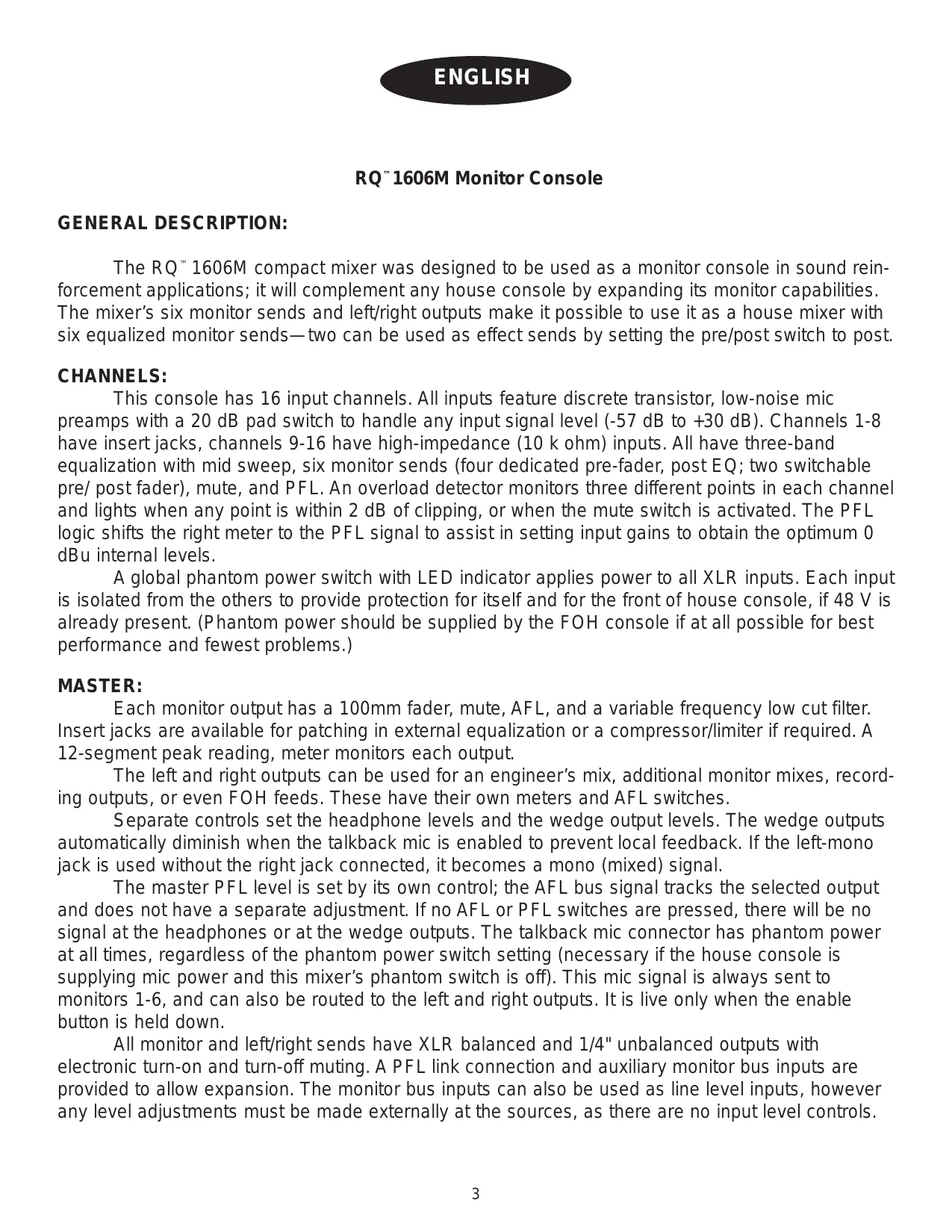 ENGLISH RQ™1606M Monitor Console GENERAL DESCRIPTION: The RQ™ 1606M compact mixer was designed to be used as a monitor console in sound reinforcement applications; it will complement any house console by expanding its monitor capabilities. The mixer’s six monitor sends and left/right outputs make it possible to use it as a house mixer with six equalized monitor sends—two can be used as effect sends by setting the pre/post switch to post. CHANNELS: This console has 16 input channels. All inputs feature discrete transistor, low-noise mic preamps with a 20 dB pad switch to handle any input signal level (-57 dB to +30 dB). Channels 1-8 have insert jacks, channels 9-16 have high-impedance (10 k ohm) inputs. All have three-band equalization with mid sweep, six monitor sends (four dedicated pre-fader, post EQ; two switchable pre/ post fader), mute, and PFL. An overload detector monitors three different points in each channel and lights when any point is within 2 dB of clipping, or when the mute switch is activated. The PFL logic shifts the right meter to the PFL signal to assist in setting input gains to obtain the optimum 0 dBu internal levels. A global phantom power switch with LED indicator applies power to all XLR inputs. Each input is isolated from the others to provide protection for itself and for the front of house console, if 48 V is already present. (Phantom power should be supplied by the FOH console if at all possible for best performance and fewest problems.) MASTER: Each monitor output has a 100mm fader, mute, AFL, and a variable frequency low cut filter. Insert jacks are available for patching in external equalization or a compressor/limiter if required. A 12-segment peak reading, meter monitors each output. The left and right outputs can be used for an engineer’s mix, additional monitor mixes, recording outputs, or even FOH feeds. These have their own meters and AFL switches. Separate controls set the headphone levels and the wedge output levels. The wedge outputs automatically diminish when the talkback mic is enabled to prevent local feedback. If the left-mono jack is used without the right jack connected, it becomes a mono (mixed) signal. The master PFL level is set by its own control; the AFL bus signal tracks the selected output and does not have a separate adjustment. If no AFL or PFL switches are pressed, there will be no signal at the headphones or at the wedge outputs. The talkback mic connector has phantom power at all times, regardless of the phantom power switch setting (necessary if the house console is supplying mic power and this mixer’s phantom switch is off). This mic signal is always sent to monitors 1-6, and can also be routed to the left and right outputs. It is live only when the enable button is held down. All monitor and left/right sends have XLR balanced and 1/4" unbalanced outputs with electronic turn-on and turn-off muting. A PFL link connection and auxiliary monitor bus inputs are provided to allow expansion. The monitor bus inputs can also be used as line level inputs, however any level adjustments must be made externally at the sources, as there are no input level controls.