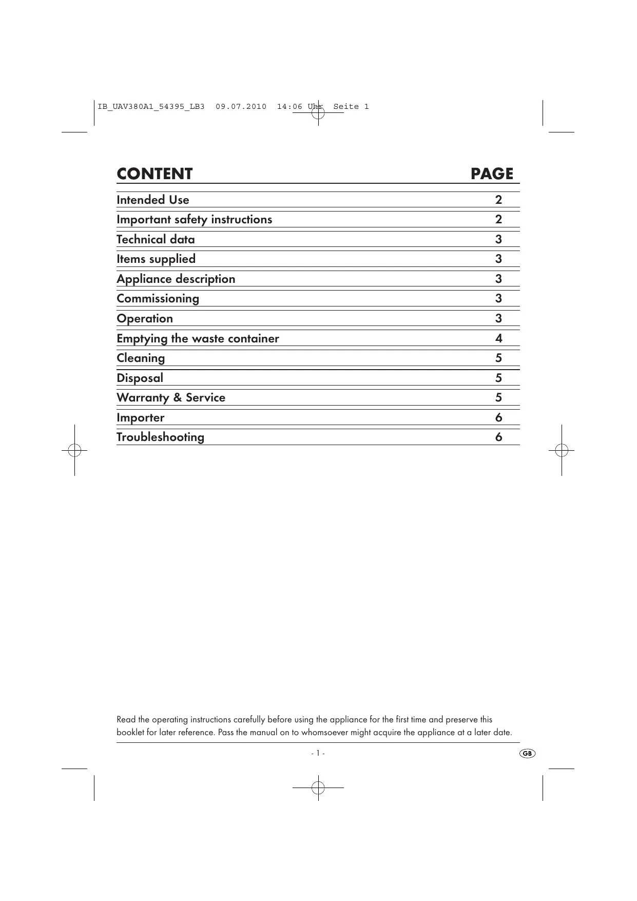 CONTENT PAGE Intended Use Important safety instructions Technical data Items supplied Appliance description Commissioning Operation Emptying the waste container Cleaning Disposal Warranty & Service Importer Troubleshooting œouiiulinl Bow) co) wc! Read the operating instructions carefully before using the appliance for the first time and preserve this booklet for later reference. Pass the manual on to whomsoever might acquire the appliance at a later date.