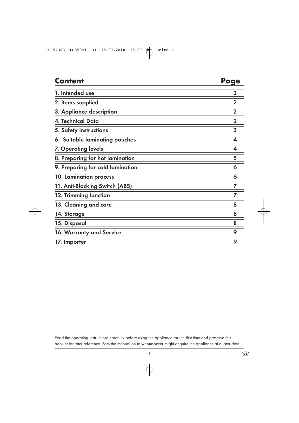 This laminator is intended exclusively for use in priva- te households and for the hot and cold lamination of documents printed on paper or cardboard Additionally, the documents can be trimmed. It is NOT intended for use with any other materials. His also NOT intended for commercial or industrial applications. The warranty does not provide compensation for damage caused by improper use ofthe appliancel
