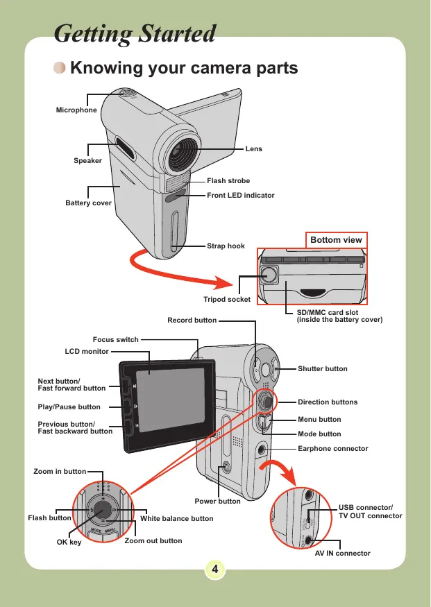 Getting Started ) Knowing your camera parts Microphone Bottom view Strap hook
