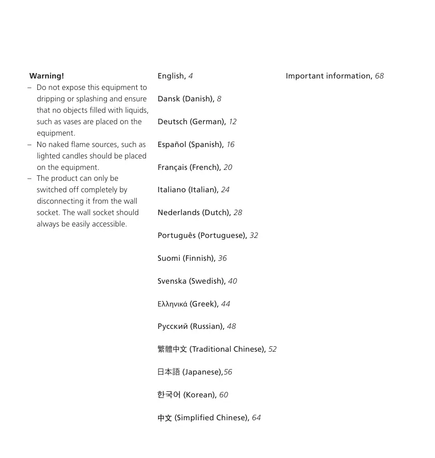 – Do not expose this equipment to dripping or splashing and ensure that no objects filled with liquids, such as vases are placed on the equipment. – No naked flame sources, such as lighted candles should be placed on the equipment. – The product can only be switched off completely by disconnecting it from the wall socket. The wall socket should always be easily accessible.