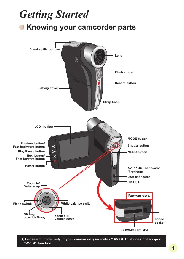 Getting Started. Knowing your camcorder part Installing the battery. Charging the battery . . Inserting a memory card (optional) Tuming onfoff your camcorder Setting language…… . Reading LCD indicators….