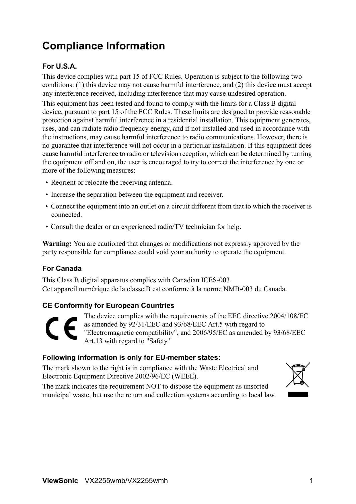 party responsible for compliance could void your authority to operate the equipment. For Canada This Class B digital apparatus complies with Canadian ICES-003. Cet appareil numérique de la classe B est conforme à la norme NMB-003 du Canada. CE Conformity for European Countries The device complies with the requirements of the EEC directive 2004/108/EC as amended by 92/31/EEC and 93/68/EEC Art.5 with regard to "Electromagnetic compatibility", and 2006/95/EC as amended by 93/68/EEC Att.13 with regard to "Safety." Following information is only for EU-member states: The mark shown to the right is in compliance with the Waste Electrical and Electronic Equipment Directive 2002/96/EC (WEEE). The mark indicates the requirement NOT to dispose the equipment as unsorted municipal waste, but use the return and collection systems according to local law. ISSN ViewSonic VX2255wmb/VX2255wmh 1