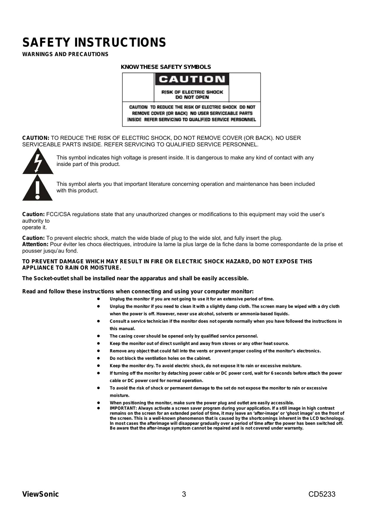 CAUTION TO REDUCE THE RISK OF ELECTRIC SHOCK DO NOT REMOVE COVER [OR BACK) NO USER SERVICEABLE PARTS INSIDE REFER SERVICING TO QUALIFIED SERVICE PERSONNEL CAUTION: TO REDUCE THE RISK OF ELECTRIC SHOCK, DO NOT REMOVE COVER (OR BACK). NO USER SERVICEABLE PARTS INSIDE. REFER SERVICING TO QUALIFIED SERVICE PERSONNEL. This symbol indicates high voltage is present inside. It is dangerous to make any kind of contact with any inside part of this product. This symbol alerts you that important literature concerning operation and maintenance has been included with this product. Caution: FCC/CSA regulations state that any unauthorized changes or modifications to this equipment may void the user's authority to operate it. Caution: To prevent electric shock, match the wide blade of plug to the wide slot, and fully insert the plug. Attention: Pour éviter les chocs électriques, introduire la lame la plus large de la fiche dans la bome correspondante de la prise et pousser jusqu'au fond. TO PREVENT DAMAGE WHICH MAY RESULT IN FIRE OR ELECTRIC SHOCK HAZARD, DO NOT EXPOSE THIS APPLIANCE TO RAIN OR MOISTURE. The Socket-outlet shall be installed near the apparatus and shall be easily accessible. Read and follow these instructions when connecting and using your computer monitor: © Unplug the monitor if you are not going to use it for an extensive period of time. © Unplug the monitor if you need to clean itwith a slightly damp cloth. The screen many be wiped with a dry cloth when the power is off. However, never use alcohol, solvents or ammonia-based liquids. © Consuita service technician ifthe monitor does not operate normally when you have followed the instructions in this manual. The casing cover should be opened only by qualified service personnel. Keep the monitor out of direct sunlight and away from stoves or any other heat source. Remove any object that could fall into the vents or prevent proper cooling of the monitor's electronics. Do not block the ventilation holes on the cabinet. Keep the monitor dry. To avoid electric shock, do not expose itto rain or excessive moisture. Hturing off the monitor by detaching power cable or DC power cord, wait for 6 seconds before attach the power cable or DC power cord for normal operation, © To avoid the risk of shock or permanent damage to the set do not expose the monitor to rain or excessive moisture. When positioning the monitor, make sure the power plug and outiet are easily accessible. IMPORTANT: Always activate a screen saver program during your application. If a still image in high contrast remains on the screen for an extended period of time, it may leave an ‘after-image” or ‘ghost image” on the front of the screen. This is a well-known phenomenon that is caused by the shortcomings inherent in the LCD technology. In most cases the afterimage will disappear gradually over a period of time after the power has been switched off. Be aware that the after-image symptom cannot be repaired and is not covered under warranty. ViewSonic 3 CD5233