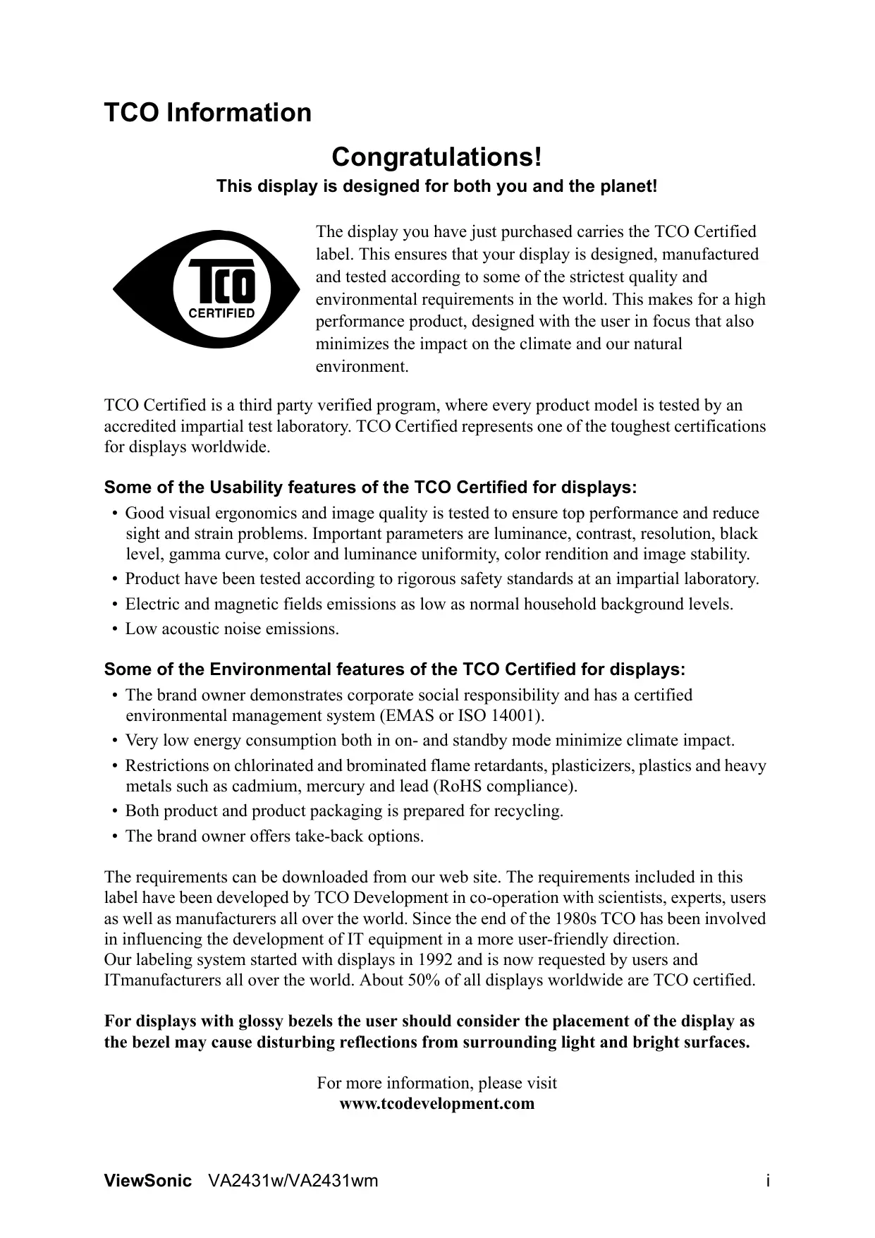 TCO Information Congratulations! This display is designed for both you and the planet! The display you have just purchased carries the TCO Certified label. This ensures that your display is designed, manufactured and tested according to some of the strictest quality and environmental requirements in the world. This makes for a high performance product, designed with the user in focus that also minimizes the impact on the climate and our natural environment. TCO Certified is a third party verified program, where every product model is tested by an accredited impartial test laboratory. TCO Certified represents one of the toughest certifications for displays worldwide. Some of the Usability features of the TCO Certified for displays: + Good visual ergonomics and image quality is tested to ensure top performance and reduce sight and strain problems. Important parameters are luminance, contrast, resolution, black level, gamma curve, color and luminance uniformity, color rendition and image stability. + Product have been tested according to rigorous safety standards at an impartial laboratory. + Electric and magnetic fields emissions as low as normal household background levels. + Low acoustic noise emissions. Some of the Environmental features of the TCO Certified for displays: + The brand owner demonstrates corporate social responsibility and has a certified environmental management system (EMAS or ISO 14001). + Very low energy consumption both in on- and standby mode minimize climate impact. + Restrictions on chlorinated and brominated flame retardants, plasticizers, plastics and heavy metals such as cadmium, mercury and lead (RoHS compliance). + Both product and product packaging is prepared for recycling. + The brand owner offers take-back options. The requirements can be downloaded from our web site. The requirements included in this label have been developed by TCO Development in co-operation with scientists, experts, users as well as manufacturers all over the world. Since the end of the 1980s TCO has been involved in influencing the development of IT equipment in a more user-friendly direction. Our labeling system started with displays in 1992 and is now requested by users and ITmanufacturers all over the world. About 50% of all displays worldwide are TCO certified. For displays with glossy bezels the user should consider the placement of the display as the bezel may cause disturbing reflections from surrounding light and bright surfaces. For more information, please visit www.tcodevelopment.com ViewSonic VA2431w/VA2431wm i