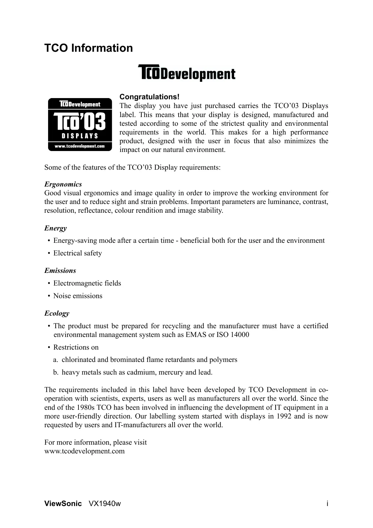 TCO Information TtODevelopment Congratulations! Tübevelopment The display you have just purchased carries the TCO’03 Displays 7 label. This means that your display is designed, manufactured and ICO 03 tested according to some of the strictest quality and environmental requirements in the world. This makes for a high performance product, designed with the user in focus that also minimizes the DISPLAYS impact on our natural environment. Some of the features of the TCO’03 Display requirements: Ergonomics Good visual ergonomics and image quality in order to improve the working environment for the user and to reduce sight and strain problems. Important parameters are luminance, contrast, resolution, reflectance, colour rendition and image stability. Energy + Energy-saving mode after a certain time - beneficial both for the user and the environment + Electrical safety Emissions + Electromagnetic fields + Noise emissions Ecology + The product must be prepared for recycling and the manufacturer must have a certified environmental management system such as EMAS or ISO 14000 + Restrictions on a. chlorinated and brominated flame retardants and polymers b. heavy metals such as cadmium, mercury and lead. The requirements included in this label have been developed by TCO Development in co- operation with scientists, experts, users as well as manufacturers all over the world. Since the end of the 1980s TCO has been involved in influencing the development of IT equipment in a more user-friendly direction. Our labelling system started with displays in 1992 and is now requested by users and IT-manufacturers all over the world. For more information, please visit www.tcodevelopment.com ViewSonic VX1940w i