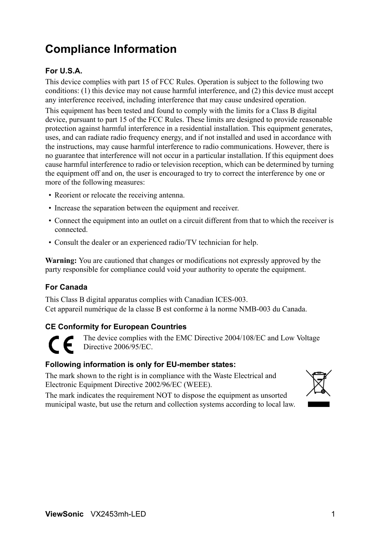 party responsible for compliance could void your authority to operate the equipment. For Canada This Class B digital apparatus complies with Canadian ICES-003. Cet appareil numérique de la classe B est conforme à la norme NMB-003 du Canada. CE Conformity for European Countries The device complies with the EMC Directive 2004/108/EC and Low Voltage C € Directive 2006/95/EC. Following information is only for EU-member states: The mark shown to the right is in compliance with the Waste Electrical and Electronic Equipment Directive 2002/96/EC (WEEE). The mark indicates the requirement NOT to dispose the equipment as unsorted municipal waste, but use the return and collection systems according to local law. IN ViewSonic VX2453mh-LED 1