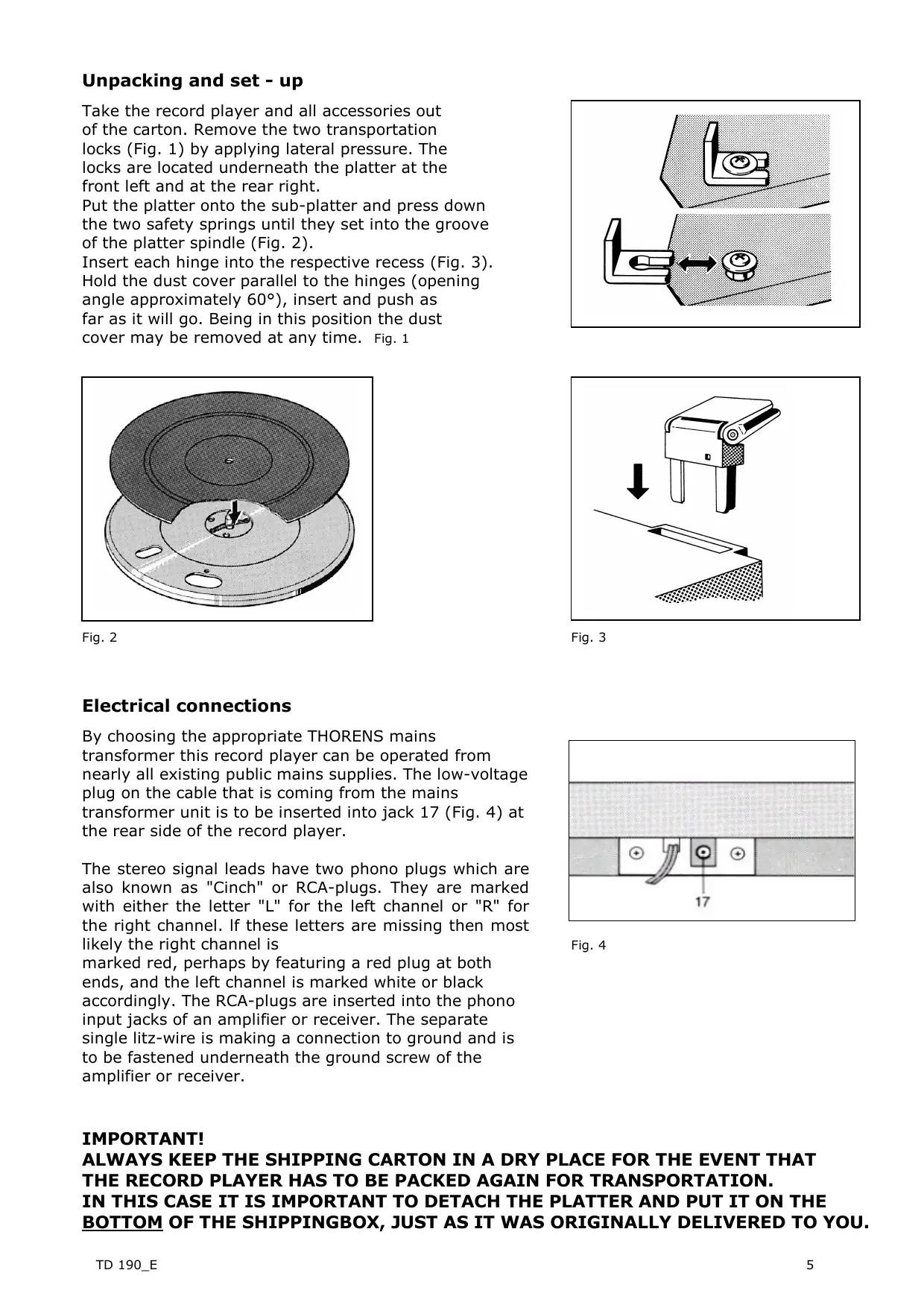 Unpacking and set - up Take the record player and all accessories out of the carton. Remove the two transportation locks (Fig. 1) by applying lateral pressure. The locks are located underneath the platter at the front left and at the rear right. Put the platter onto the sub-platter and press down the two safety springs until they set into the groove of the platter spindle (Fig. 2). Insert each hinge into the respective recess (Fig. 3). Hold the dust cover parallel to the hinges (opening angle approximately 60°), insert and push as far as it will go. Being in this position the dust cover may be removed at any time. Fig. 1 Fig. 2 Electrical connections By choosing the appropriate THORENS mains transformer this record player can be operated from nearly all existing public mains supplies. The low-voltage plug on the cable that is coming from the mains transformer unit is to be inserted into jack 17 (Fig. 4) at the rear side of the record player. The stereo signal leads have two phono plugs which are also known as "Cinch" or RCA-plugs. They are marked with either the letter "L" for the left channel or "R" for the right channel. If these letters are missing then most likely the right channel is marked red, perhaps by featuring a red plug at both ends, and the left channel is marked white or black accordingly. The RCA-plugs are inserted into the phono input jacks of an amplifier or receiver. The separate single litz-wire is making a connection to ground and is to be fastened underneath the ground screw of the amplifier or receiver. IMPORTANT! Fig. 3 Fig. 4 ALWAYS KEEP THE SHIPPING CARTON IN A DRY PLACE FOR THE EVENT THAT THE RECORD PLAYER HAS TO BE PACKED AGAIN FOR TRANSPORTATION. IN THIS CASE IT IS IMPORTANT TO DETACH THE PLATTER AND PUT IT ON THE BOTTOM OF THE SHIPPINGBOX, JUST AS IT WAS ORIGINALLY DELIVERED TO YOU. TD 190_E