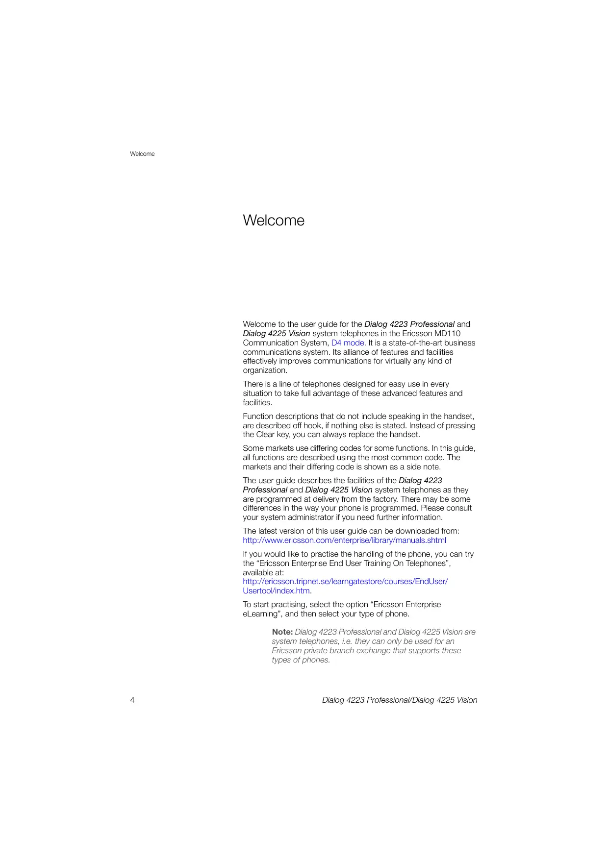 Note: Dialog 4223 Professional and Dialog 4225 Vision are system telephones, i.e. they can only be used for an Ericsson private branch exchange that supports these types of phones.