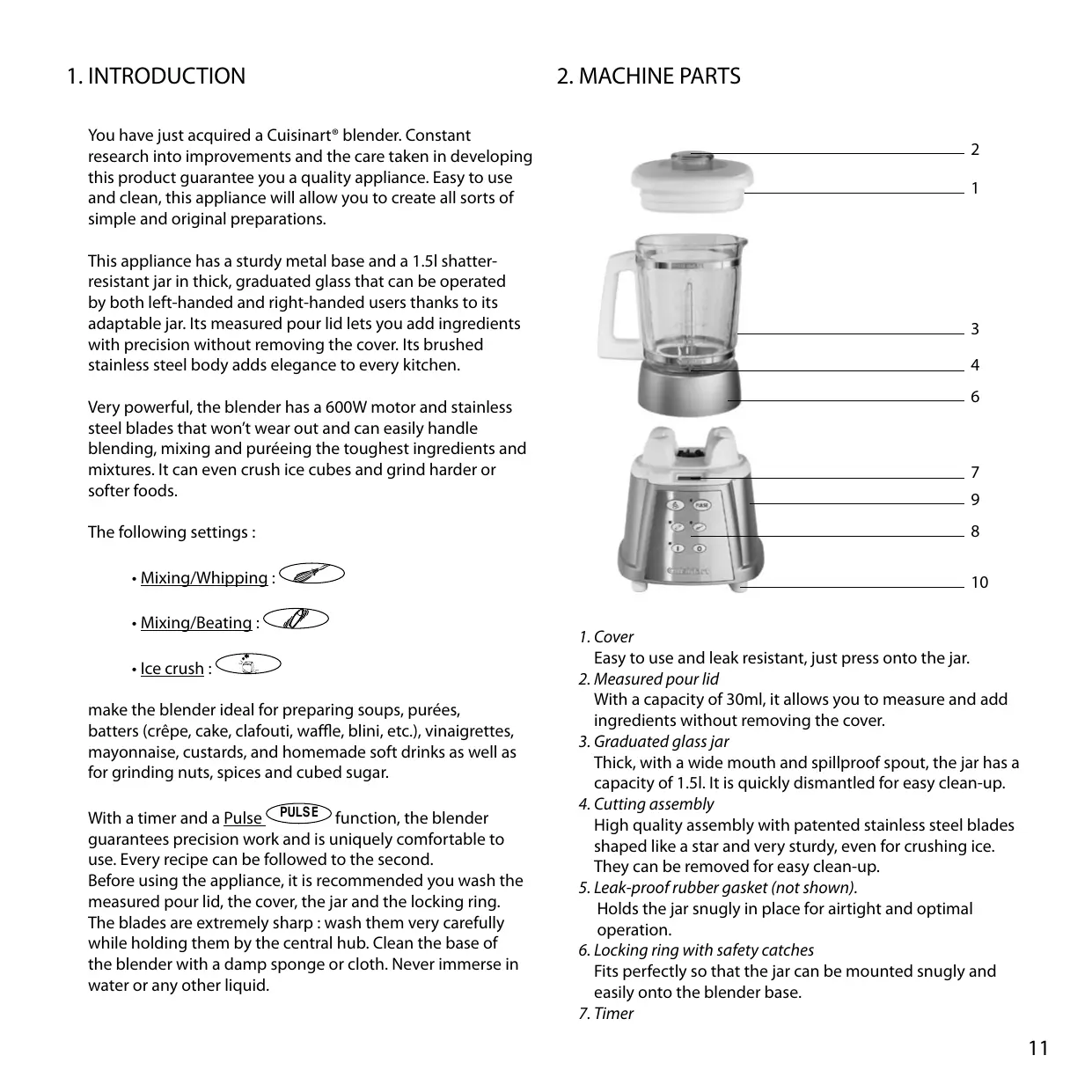 1. INTRODUCTION You have just acquired a Cuisinart® blender. Constant research into improvements and the care taken in developing this product guarantee you a quality appliance. Easy to use and clean, this appliance will allow you to create all sorts of simple and original preparations.