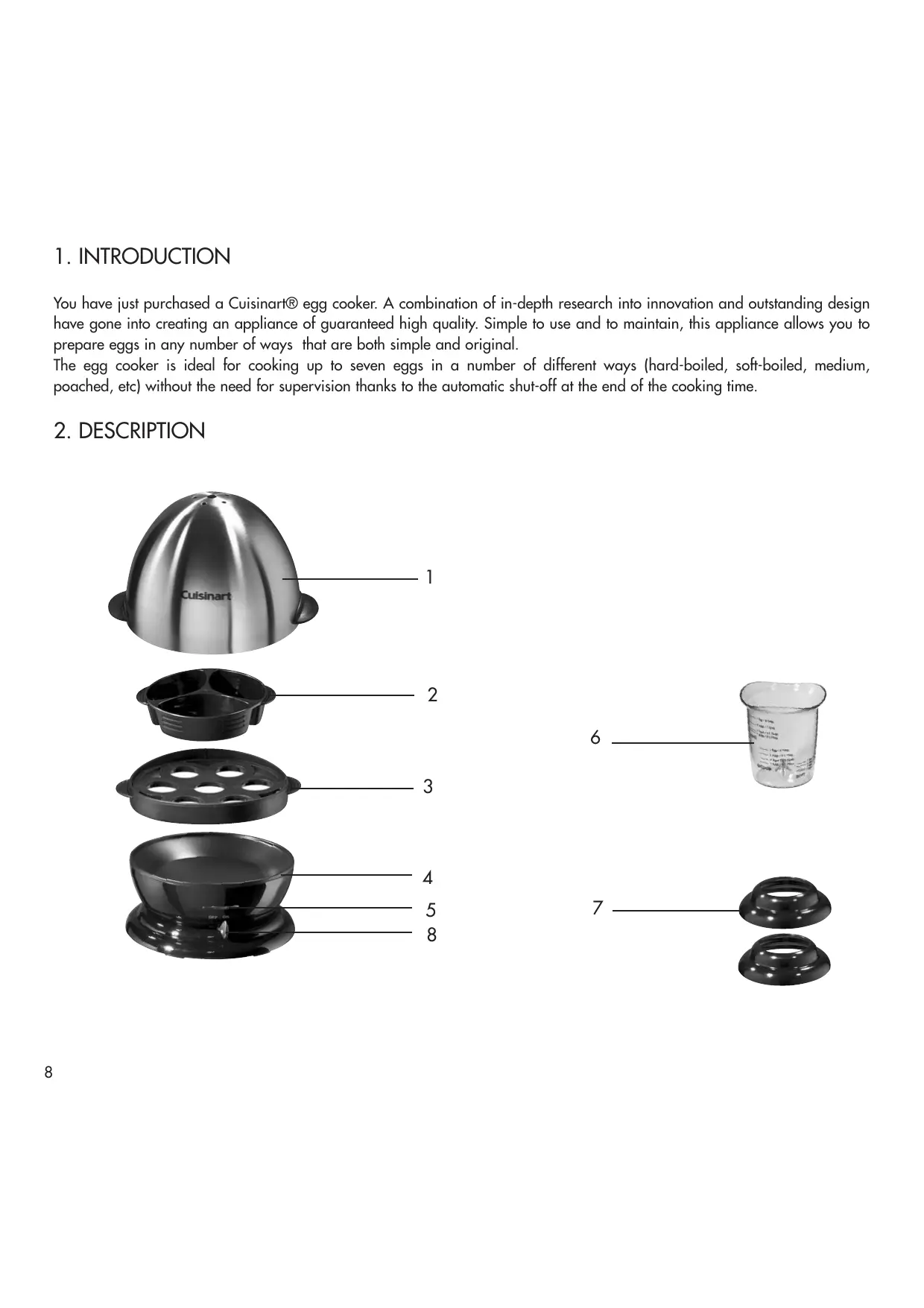 You have just purchased a Cuisinart® egg cooker. A combination of in-depth research into innovation and outstanding design have gone into creating an appliance of guaranteed high quality. Simple to use and to maintain, this appliance allows you to prepare eggs in any number of ways that are both simple and original. The egg cooker is ideal for cooking up to seven eggs in a number of different ways (hard-boiled, soft-boiled, medium, poached, etc) without the need for supervision thanks to the automatic shut-off at the end of the cooking time.