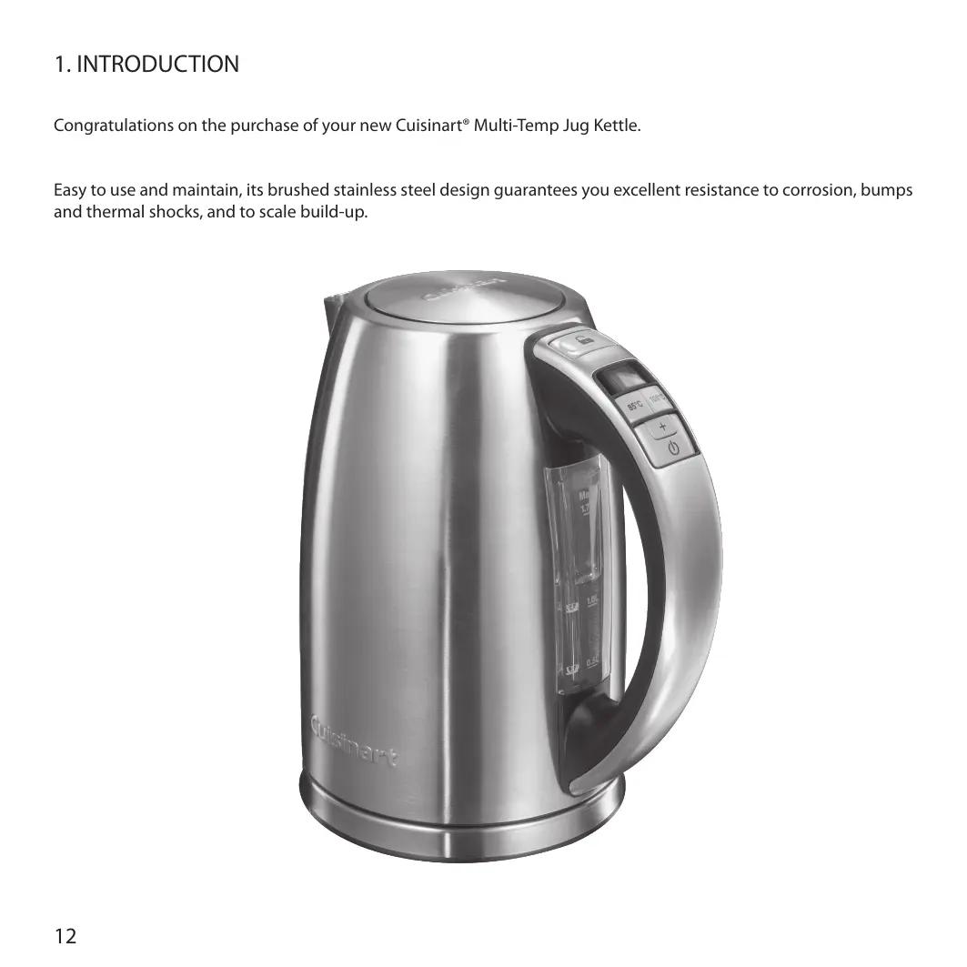 Congratulations on the purchase of your new Cuisinart® Multi-Temp Jug Kettle. Easy to use and maintain, its brushed stainless steel design guarantees you excellent resistance to corrosion, bumps and thermal shocks, and to scale build-up.