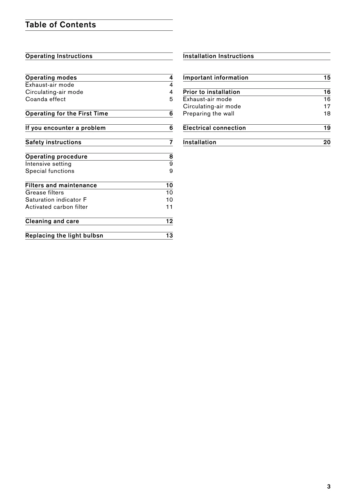 Table of Contents Operating Instructions Installation Instructions Operating modes 4 Important information 15 Exhaust-air mode 4 Circulating-air mode 4 Priorto installation 16 Coanda effect 5 Exhaust-air mode 16 Circulating-air mode 17 Operating for the First Time 6 Preparing the wall 18 If you encounter a problem 6 Electrical connection 19 Safety instructions 7 Installation 20 Operating procedure 8 Intensive setting 9 Special functions 9 Filters and maintenance 10 Grease filters 10 Saturation indicator F 10 Activated carbon filter 11 Cleaning and care 12 Replacing the light bulbsn 13