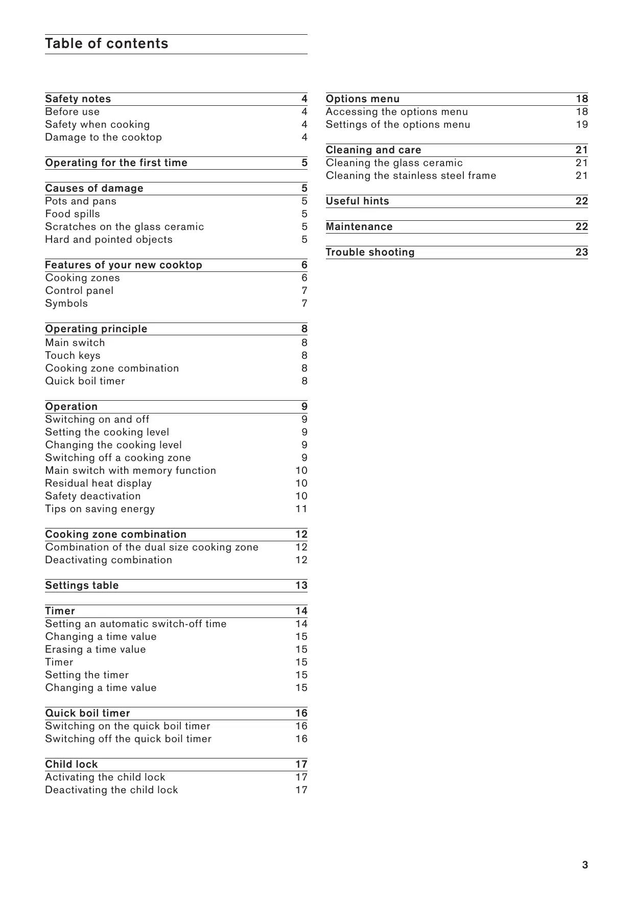 Always keep the cooktop dry and clean. Salt, sugar and sand cause scratches on the glass ceramic. Do not use the cooktop as a work surface or storage space.