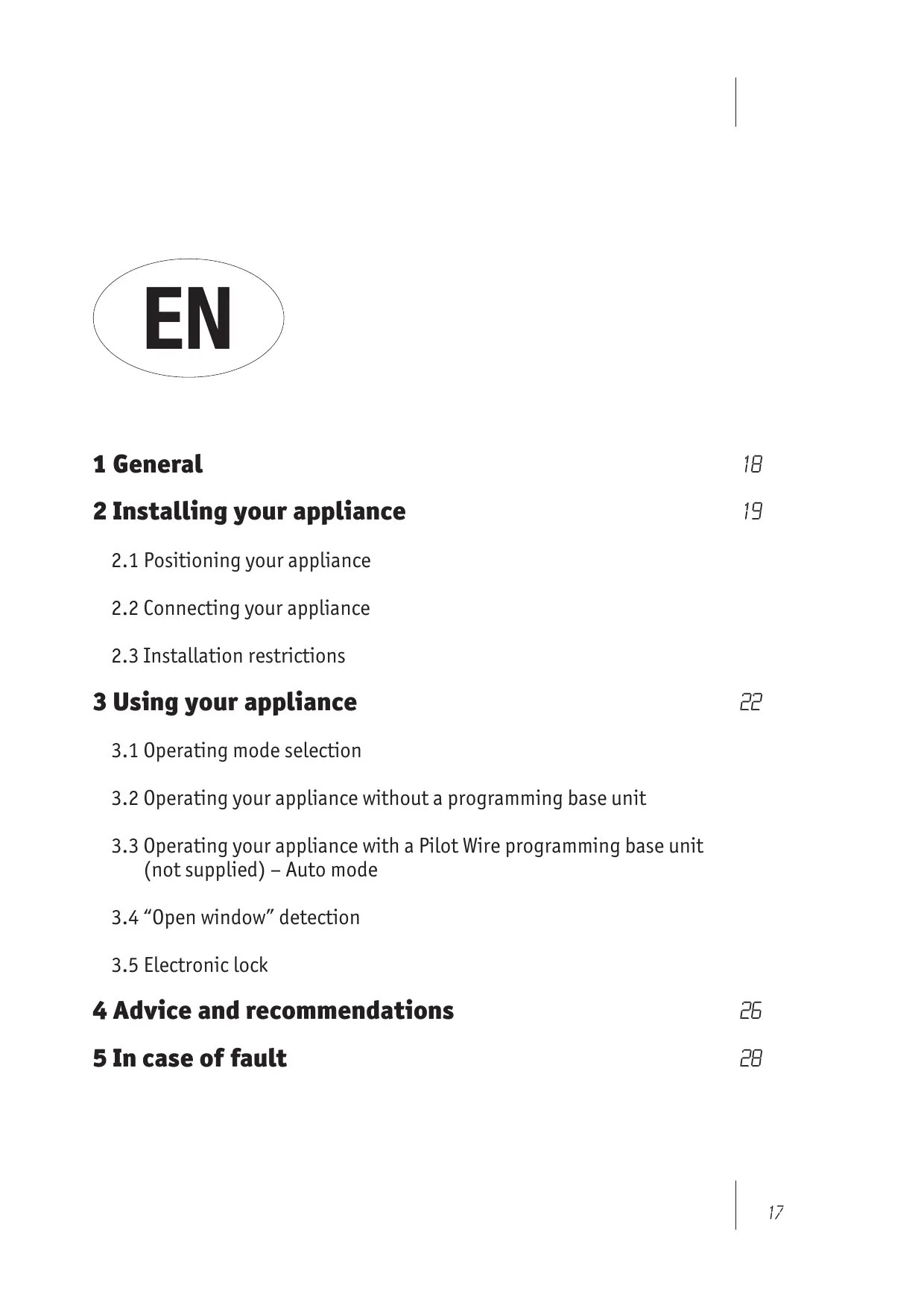 PILOT WIRE UNIT If your radiator is connected to a Pilot Wire unit, please see the instructions supplied with the unit for information on operating your appliance via Pilot Wire. NOTE Your appliance is equipped with an integrated electronic control system and we cannot accept any liability should the appliance be used with Pilot Wire control units that function by disconnecting the supply voltage (refer to the instructions supplied with your control unit). If your radiator stops receiving instructions, when in AUTO mode it will operate to your COMFORT mode settings until a new mode command is received from the Pilot Wire unit.