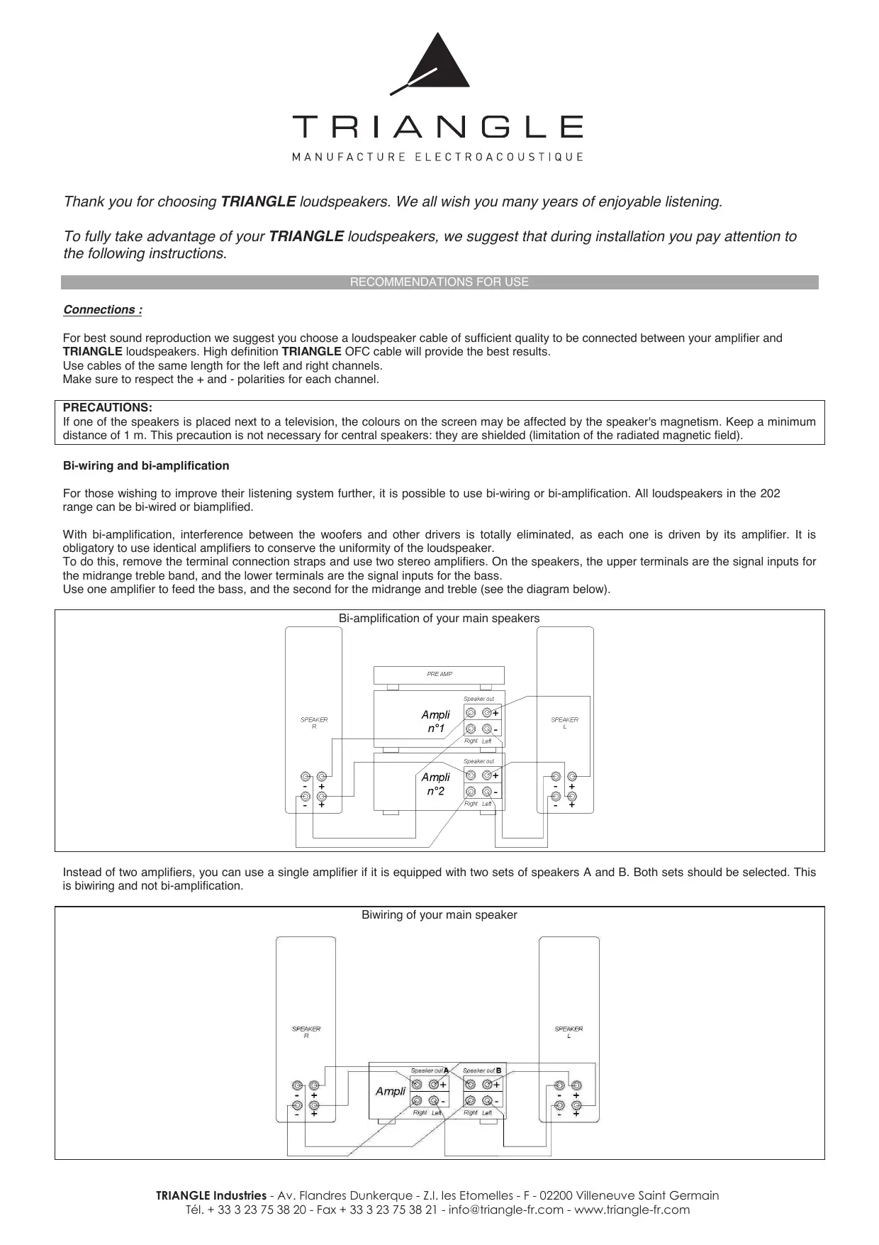 For best sound reproduction we suggest you choose a loudspeaker cable of sufficient quality to be connected between your amplifier and TRIANGLE loudspeakers. High definition TRIANGLE OFC cable will provide the best results.