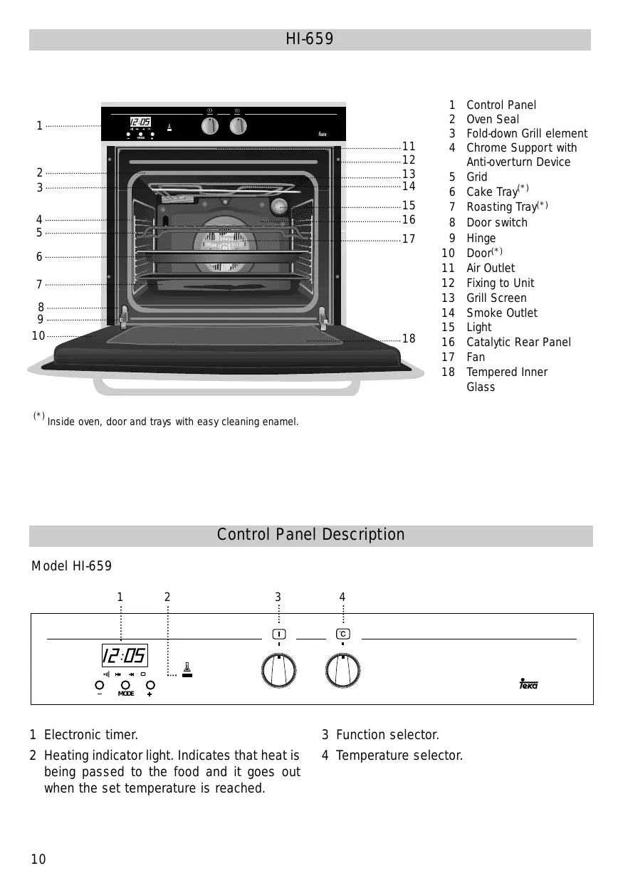 Inside oven, door and trays with easy cleaning enamel. Control Panel Description Model HI-659