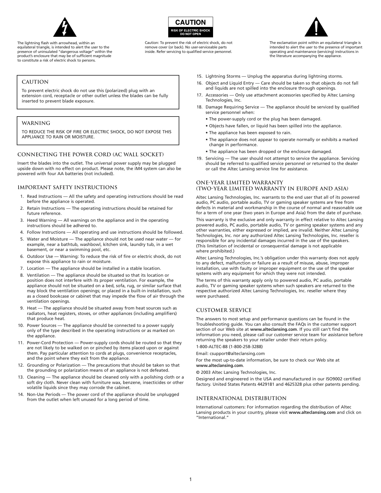 19. Servicing — The user should not attempt to service the appliance. Servicing should be referred to qualified service personnel or returned to the dealer or call the Altec Lansing service line for assistance.