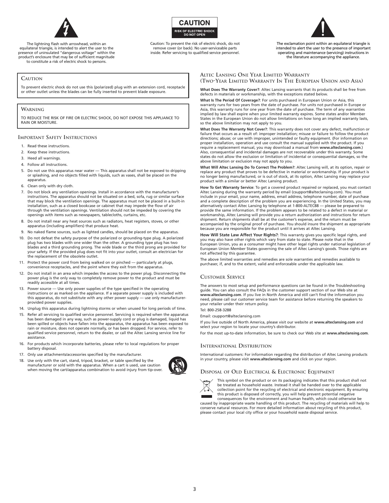 (TWO-YEAR LIMITED WARRANTY IN THE EUROPEAN UNION CAUTION To prevent electric shock do not use this (polarized) plug with an extension cord, receptacle or other outlet unless the blades can be fully inserted to prevent blade exposure. AND ASIA) What Does The Warranty Cover?: Altec Lansing warrants that its products shall be free from defects in materials or workmanship, with the exceptions stated below. What Is The Period Of Coverage?: For units purchased in European Union or Asia, this warranty runs for two years from the date of purchase. For units not purchased in Europe or Asia, this warranty runs for one year from the date of purchase. The term of any warranties implied by law shall expire when your limited warranty expires. Some states and/or Member States in the European Union do not allow limitations on how long an implied warranty lasts, so the above limitation may not apply to you. WARNING TO REDUCE THE RISK OF FIRE OR ELECTRIC SHOCK, DO NOT EXPOSE THIS APPLIANCE TO RAIN OR MOISTURE. What Does The Warranty Not Cover?: This warranty does not cover any defect, malfunction or failure that occurs as a result of: improper installation; misuse or failure to follow the product directions; abuse; or use with improper, unintended or faulty equipment. (For information on proper installation, operation and use consult the manual supplied with the product. If you require a replacement manual, you may download a manual from www.alteclansing.com.) Also, consequential and incidental damages are not recoverable under this warranty. Some states do not allow the exclusion or limitation of incidental or consequential damages, so the above limitation or exclusion may not apply to you.