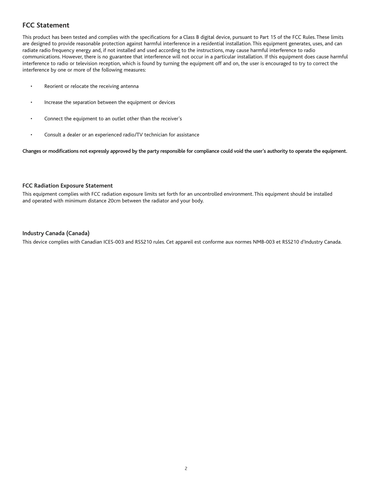 FCC Statement This product has been tested and complies with the specifications for a Class B digital device, pursuant to Part 15 of the FCC Rules. These limits are designed to provide reasonable protection against harmful interference in a residential installation. This equipment generates, uses, and can radiate radio frequency energy and, if not installed and used according to the instructions, may cause harmful interference to radio communications. However, there is no guarantee that interference will not occur in a particular installation. If this equipment does cause harmful interference to radio or television reception, which is found by turning the equipment off and on, the user is encouraged to try to correct the interference by one or more of the following measures: