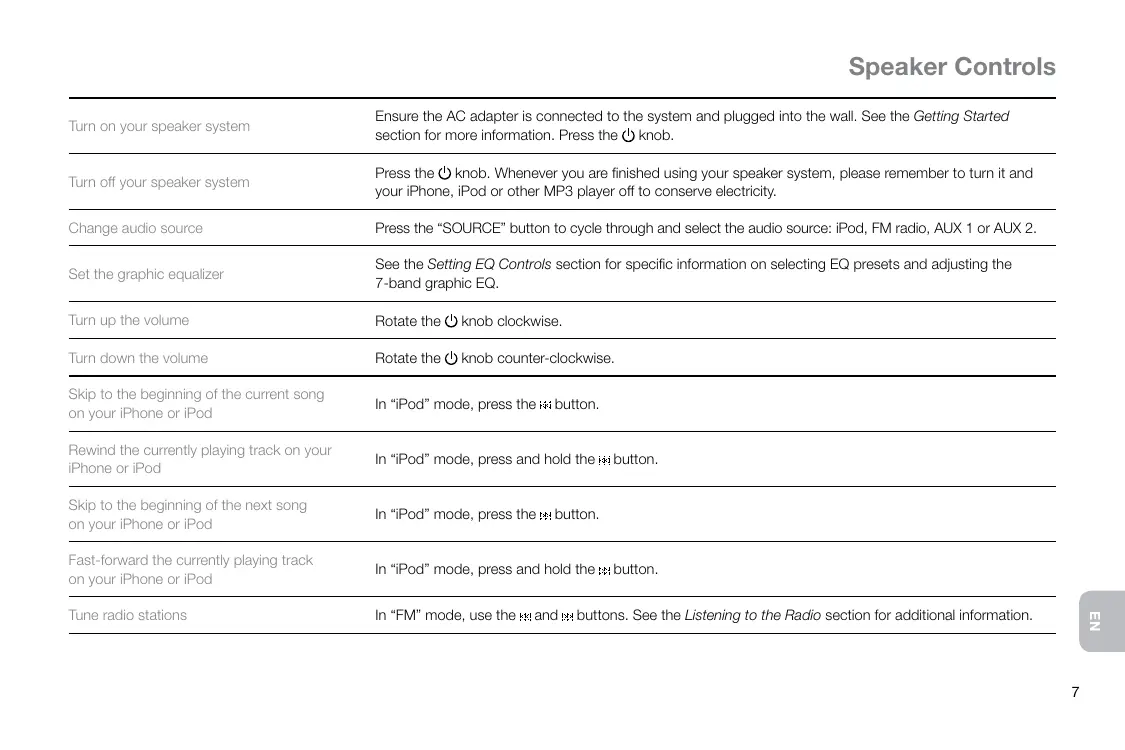 Press the knob. Whenever you are finished using your speaker system, please remember to turn it and your iPhone, iPod or other MP3 player off to conserve electricity.