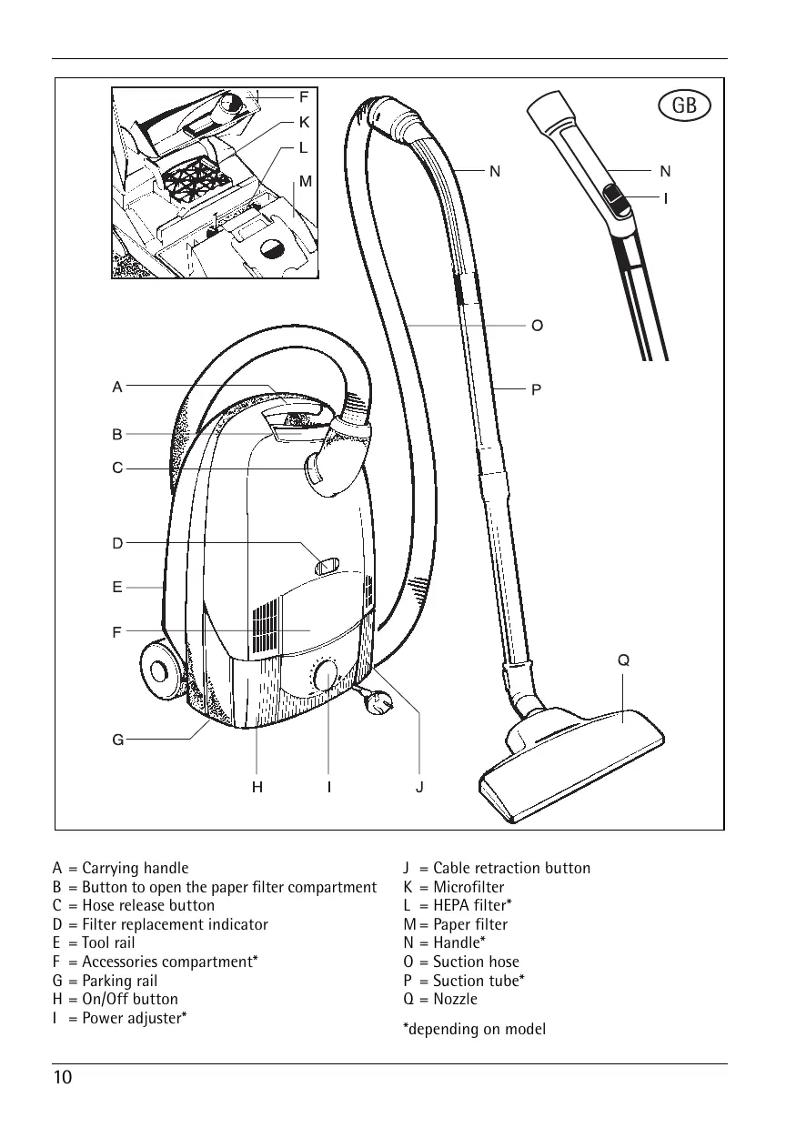 D = Filter replacement indicator Carrving handle J utton to open the paper filter compartment Hose release button Cable retraction button Microfilter HEPA filter M= Paper filter oo! rail Handle* Accessories compartment" Suction hose G = Parking rail P = Suction tube* H = On/Off button Q = Nozzle 1 = Power adjuster* “depending on model