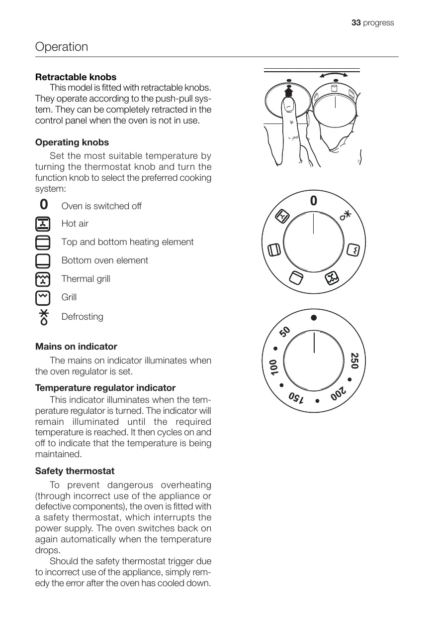 Operation 38 progress Retractable knobs This model is fitted with retractable knobs. They operate according to the push-pull sys- tem. They can be completely retracted in the control panel when the oven is not in use. Operating knobs Set the most suitable temperature by turning the thermostat knob and turn the function knob to select the preferred cooking system Oven is switched off Hot air Top and bottom heating element Bottom oven element Thermal grill Grill Defrosting x(GD0DE ° Mains on indicator The mains on indicator illuminates when the oven regulator is set. Temperature regulator indicator This indicator illuminates when the tem- perature regulator is turned. The indicator will remain illuminated until the required temperature is reached. lt then cycles on and off to indicate that the temperature is being maintainedl. Safety thermostat To prevent dangerous overheating (through incorrect use of the appliance or defective components), the ovenis fitted with a safety thermostat, which interrupts the power supply. The oven switches back on again automatically when the temperature drops. Should the safety thermostat trigger due to incorrect use of the appliance, simply rem- edy the error after the oven has cooled down.