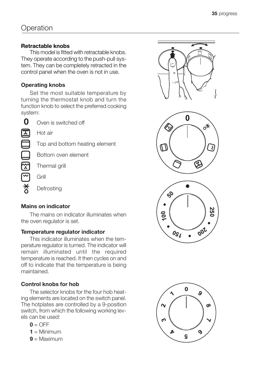 Operation 35 progress Retractable knobs This model is fitted with retractable knobs. They operate according to the push-pull sys- tem. They can be completely retracted in the control panel when the oven is not in use. Operating knobs Set the most suitable temperature by turning the thermostat knob and turn the function knob to select the preferred cooking system Oven is switched off Hot air Top and bottom heating element Bottom oven element Thermal grill DOM ° Grill Defrosting