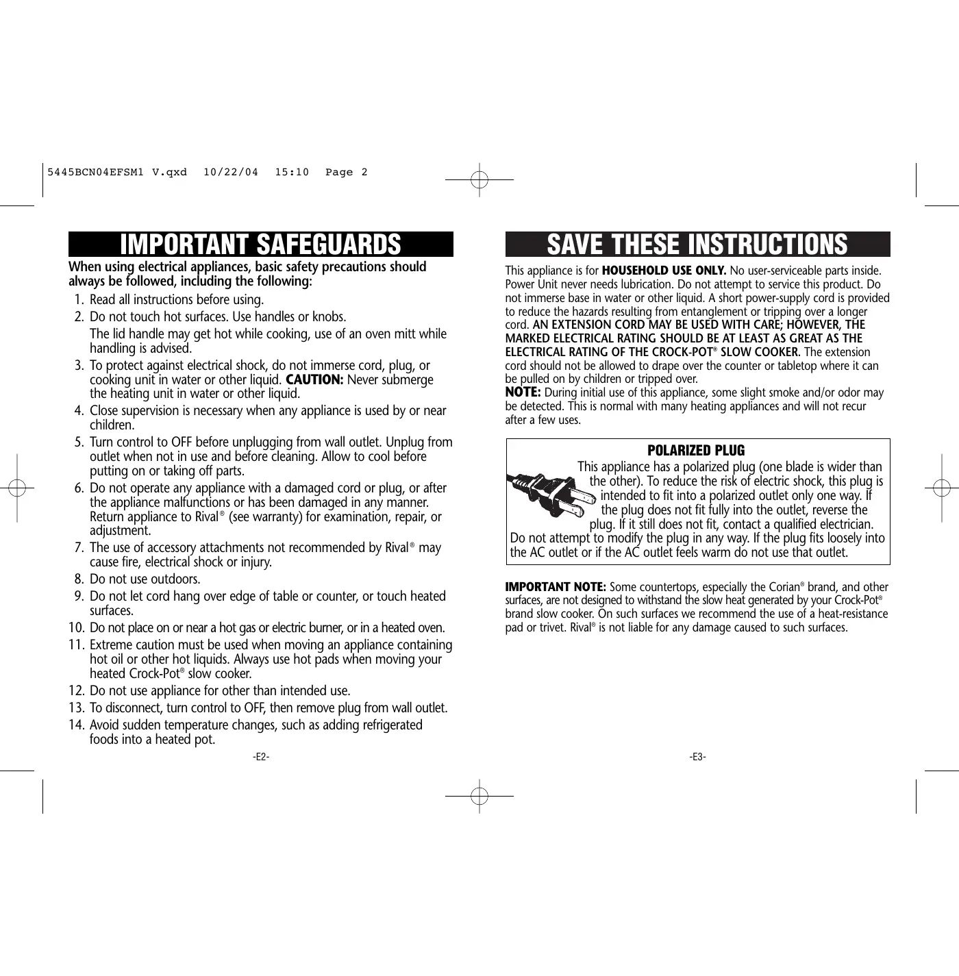 foods into a heated pot. This appliance is for HOUSEHOLD USE ONLY. No user-serviceable parts inside. Power Unit never needs lubrication. Do not attempt to service this product. Do not immerse base in water or other liquid. A short power-supply cord is provided to reduce the hazards resulting from entanglement or tripping over a longer cord. AN EXTENSION CORD MAY BE USED WITH CARE; HOWEVER, THE MARKED ELECTRICAL RATING SHOULD BE AT LEAST AS GREAT AS THE ELECTRICAL RATING OF THE CROCK-POT® SLOW COOKER. The extension cord should not be allowed to drape over the counter or tabletop where it can be pulled on by children or tripped over. NOTE: During initial use of this appliance, some slight smoke and/or odor may be detected. This is normal with many heating appliances and will not recur after a few uses. -E2- -E3- POLARIZED PLUG This appliance has a polarized plug (one blade is wider than the other). To reduce the risk of electric shock, this plug is intended to fit into a polarized outlet only one way. If the plug does not fit fully into the outlet, reverse the plug. If it still does not fit, contact a qualified electrician. Do not attempt to modify the plug in any way. If the plug fits loosely into the AC outlet or if the AC outlet feels warm do not use that outlet. IMPORTANT NOTE: Some countertops, especially the Corian® brand, and other surfaces, are not designed to withstand the slow heat generated by your Crock-Pot® brand slow cooker. On such surfaces we recommend the use of a heat-resistance pad or trivet. Rival® is not liable for any damage caused to such surfaces. 5445BCN04EFSM1 V.qxd 10/22/04 15:10 Page 4 HOW TO USE YOUR CROCK-POT® SLOW COOKER