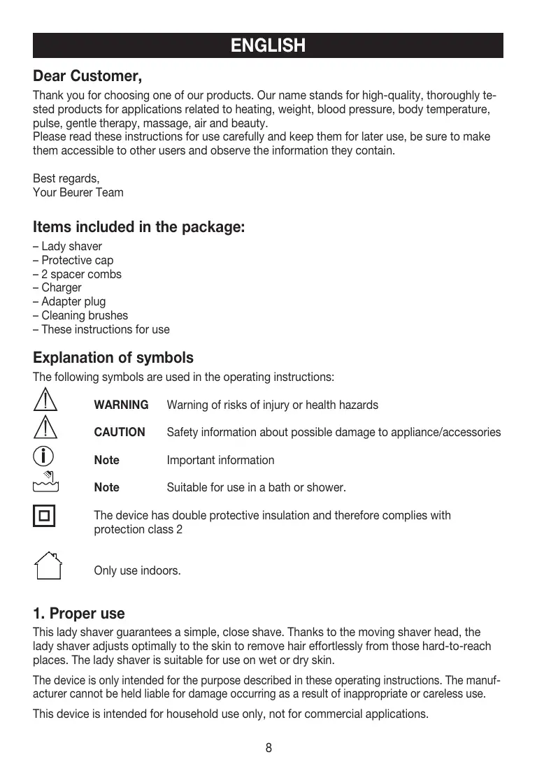 1. Proper use This lady shaver guarantees a simple, close shave. Thanks to the moving shaver head, the lady shaver adjusts optimally to the skin to remove hair effortlessly from those hard-to-reach places. The lady shaver is suitable for use on wet or dry skin. The device is only intended for the purpose described in these operating instructions. The manufacturer cannot be held liable for damage occurring as a result of inappropriate or careless use. This device is intended for household use only, not for commercial applications.