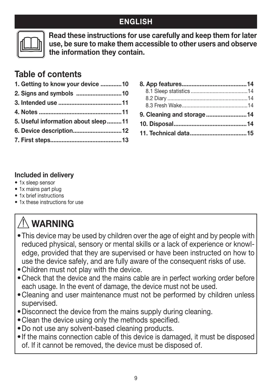 Table of contents 1. Getting to know your device10 2. Signs and symbols 10 3. Intended use11 4. Notes11 5. Useful information about sleep11 6. Device description12 7. First steps13