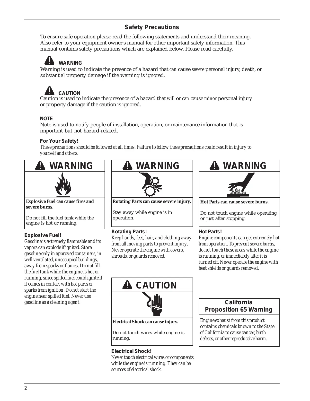 Gasolineis extremely flammable and its vapors can explodeifignited. Store gasoline only in approved containers, in well ventilated, unoccupied buildings, away from sparks or flames. D o not fill thefuel tankwhilethe engineis hot or running, sincespilled fuel could igniteif it comes in contact with hot parts or sparks from ignition. D'onot start the engine near spilled fuel. Never use gasoline as a cleaning agent.