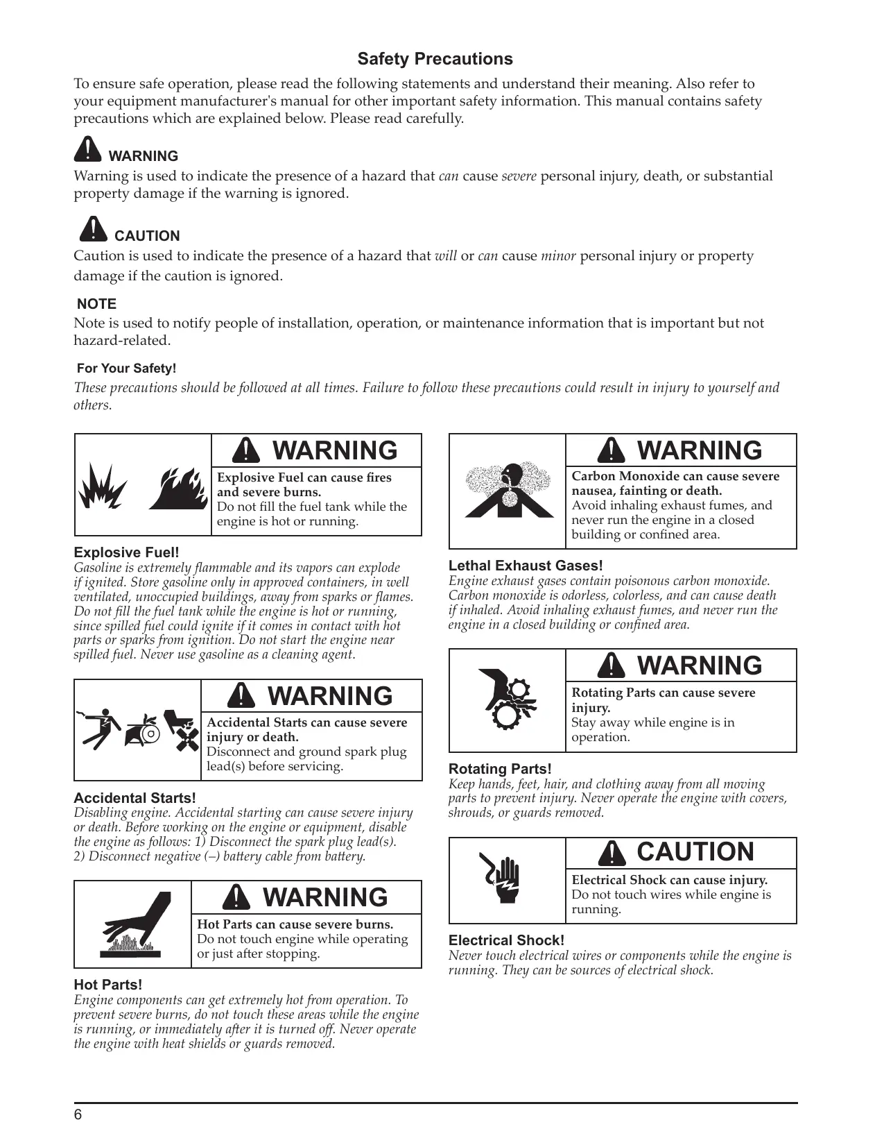 engine is hot or running. Gasoline is extremely flammable and its vapors can explode if ignited. Store gasoline only in approved containers, in well ventilated, unoccupied buildings, away from sparks or flames. Do not fill the fuel tank while the engine is hot or running since spilled fuel could ignite if it comes in contact with hot parts or sparks from ignition. Do not start the engine near Spilled fuel. Never use gasoline as a cleaning agent.