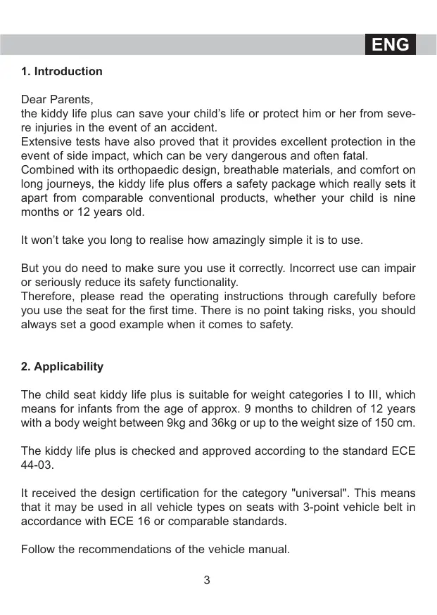 ENG If you drive with no child in the child restraint system, always secure it with the adult belt. Do not make any alterations whatsoever to the child restraint systems. The protective effect can be lost or restricted. If you experience difficulties please contact your specialist dealer or the manufacturer directly. Protect the cushion from direct sun light as it could heat up and cause discomfort. Allow your child breaks during longer journeys and ensure that your child does not get out of the vehicle and onto the road surface unattended. Always use the child locking device in car doors, if available. Ensure that the child restraint system has been fitted in the vehicle according to these directions. Do not continue to use the child restraint system if parts have been damaged or loosened after an accident (accident speed greater then 10 km/h) or through other effects. In case of doubt and after any accident please consult your dealer. Do not place any heavy objects on the rear shelf. This could be dangerous in the event of an accident.
