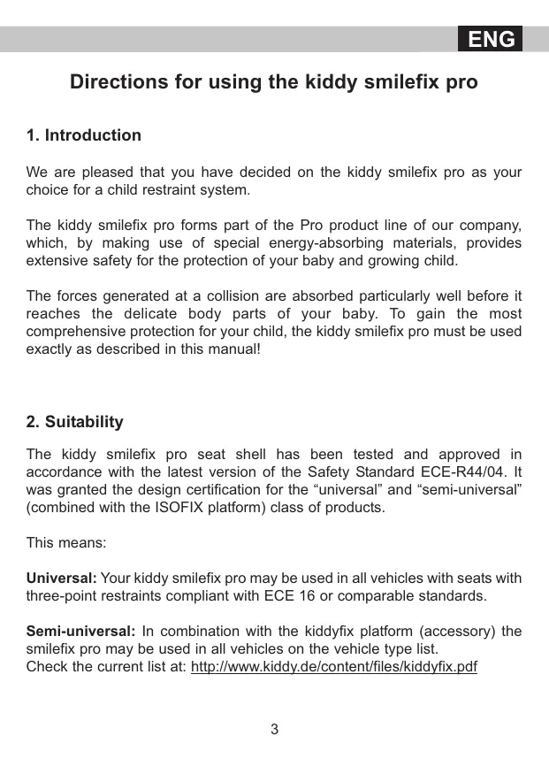 Semiuniversel : Avec la plateforme kiddyfix (accessoire), le système de retenue smilefix pro peut être utilisé dans tous les véhicules indiqués dans la liste. Vérifiez la version actuelle de cette liste à l’adresse suivante : http://www.kiddy.de/content/files/kiddyfix.pdf 3