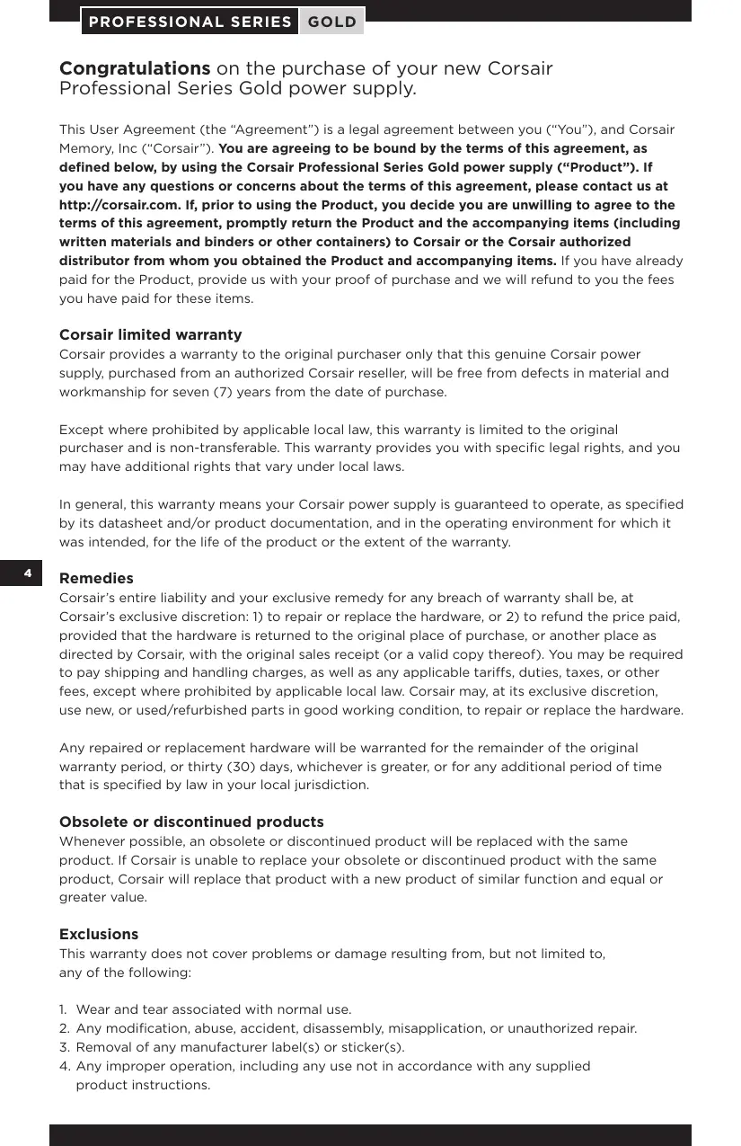 PROFESSIONAL SERIES GOLD Congratulations on the purchase of your new Corsair Professional Series Gold power supply. This User Agreement (the “Agreement”) is a legal agreement between you (“You”), and Corsair Memory, Inc (“Corsair”). You are agreeing to be bound by the terms of this agreement, as defined below, by using the Corsair Professional Series Gold power supply (“Product”). If you have any questions or concerns about the terms of this agreement, please contact us at http://corsair.com. If, prior to using the Product, you decide you are unwilling to agree to the terms of this agreement, promptly return the Product and the accompanying items (including written materials and binders or other containers) to Corsair or the Corsair authorized distributor from whom you obtained the Product and accompanying items. If you have already paid for the Product, provide us with your proof of purchase and we will refund to you the fees you have paid for these items. Corsair limited warranty Corsair provides a warranty to the original purchaser only that this genuine Corsair power supply, purchased from an authorized Corsair reseller, will be free from defects in material and workmanship for seven (7) years from the date of purchase. Except where prohibited by applicable local law, this warranty is limited to the original purchaser and is non-transferable. This warranty provides you with specific legal rights, and you may have additional rights that vary under local laws. In general, this warranty means your Corsair power supply is guaranteed to operate, as specified by its datasheet and/or product documentation, and in the operating environment for which it was intended, for the life of the product or the extent of the warranty.